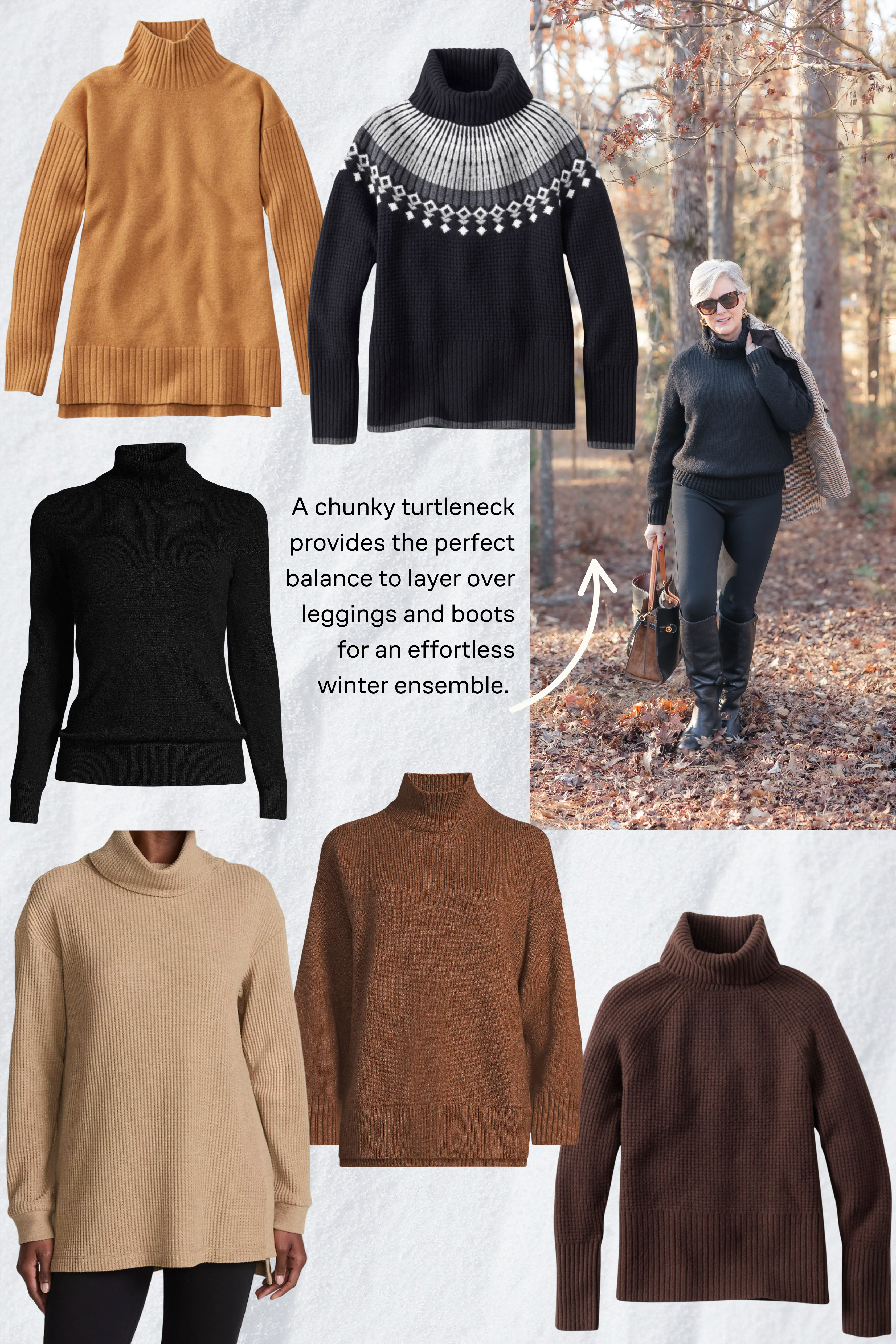 Whether it’s cashmere or cotton blend, the turtleneck is the unsung hero of winter layering. Wear it alone for a sleek look or layer it under vests, blazers, and coats. A black or ivory turtleneck will carry you through nearly every occasion — add pearls or a silk scarf for instant elegance.