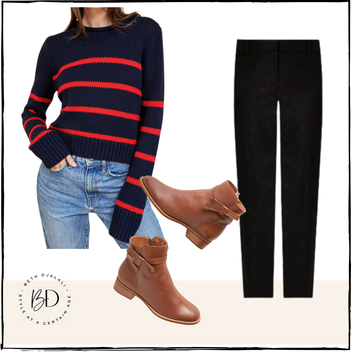 Left Board: Mini Marina Sweater (La Ligne) | No. 3 Pencil Skirt (J.Crew) | Ryan Stud Quilted Nappa Loafers (Talbots) Right Board: Mini Marina Sweater (La Ligne) | The Everyday Ankle Pant (Ann Taylor) | Tish Tie Soft Pebble Ankle Boot (Talbots)