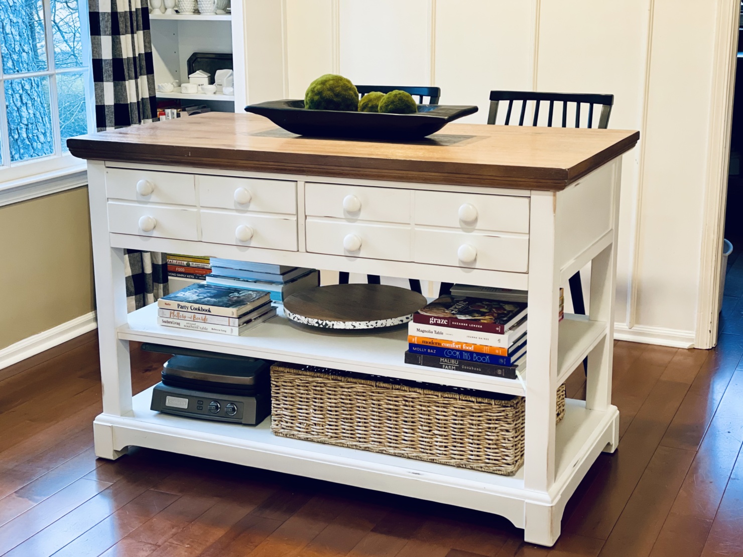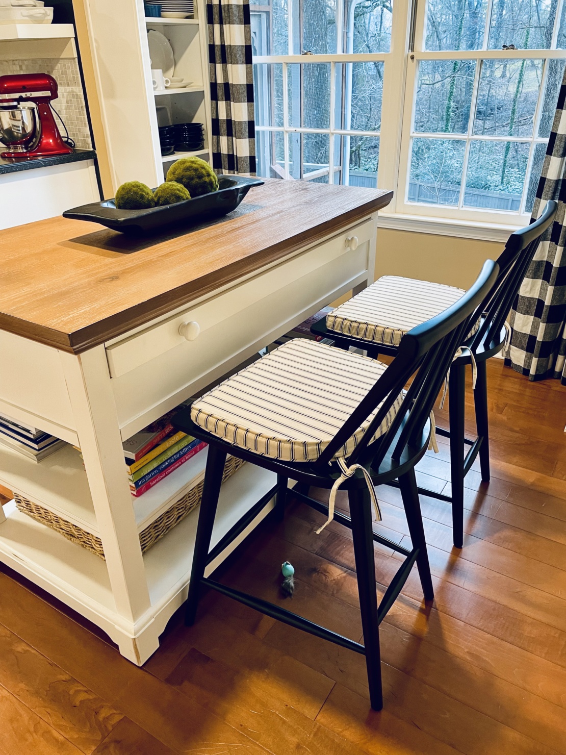 That being said, I’m thinking, just in my opinion, the island style unit would look gorgeous where the butcher block unit is, and still allow for that lovely table of yours at the window. Either way, wish I had your kitchen 👏