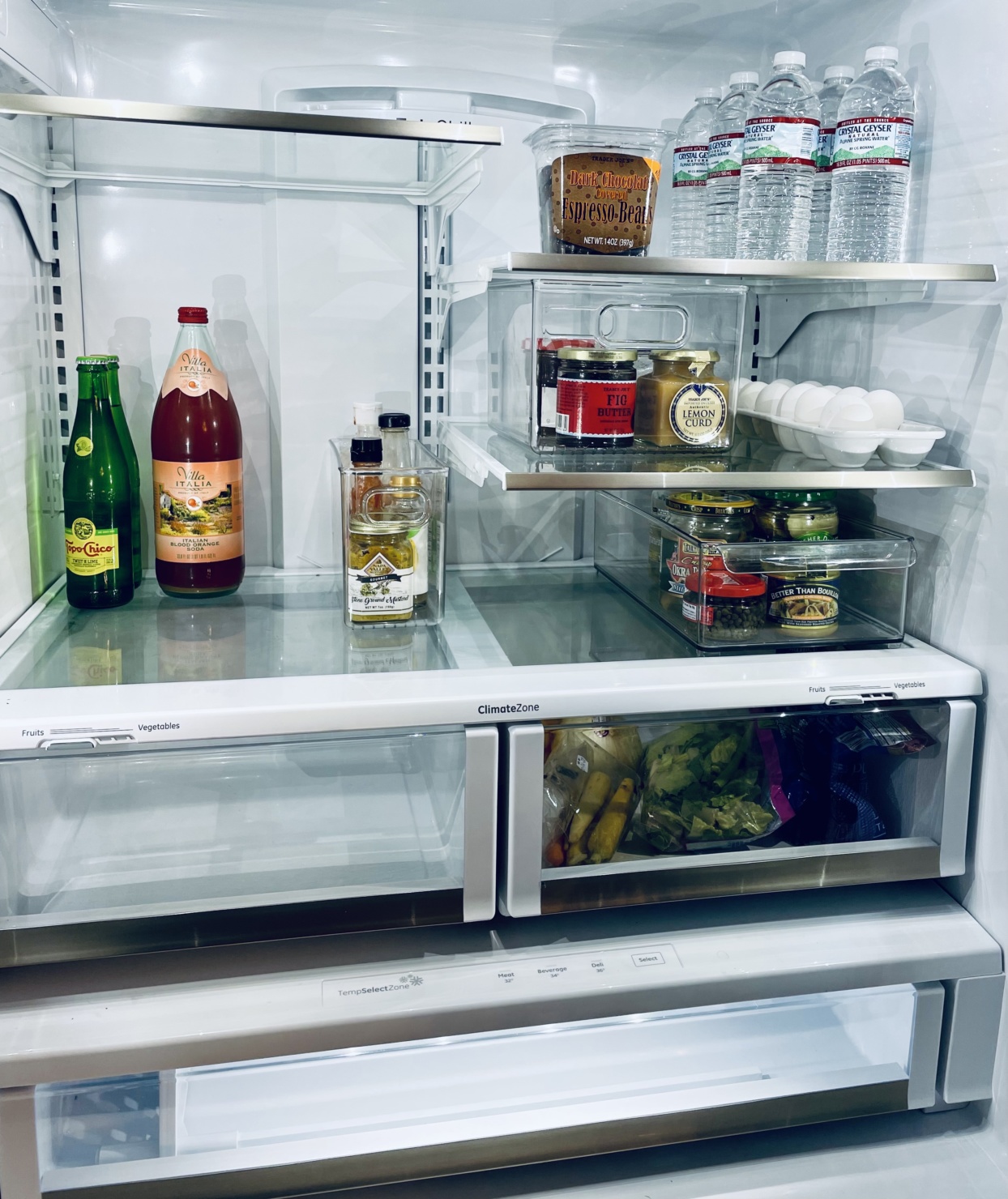 The open-shelf system gave this kitchen new life. But given that it is “open,” things have to be, well, neat and tidy. So here’s a view of how I’ve arranged everything:  from shelves to the refrigerator. Minimal for sure.