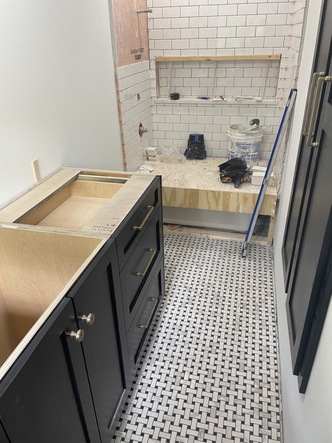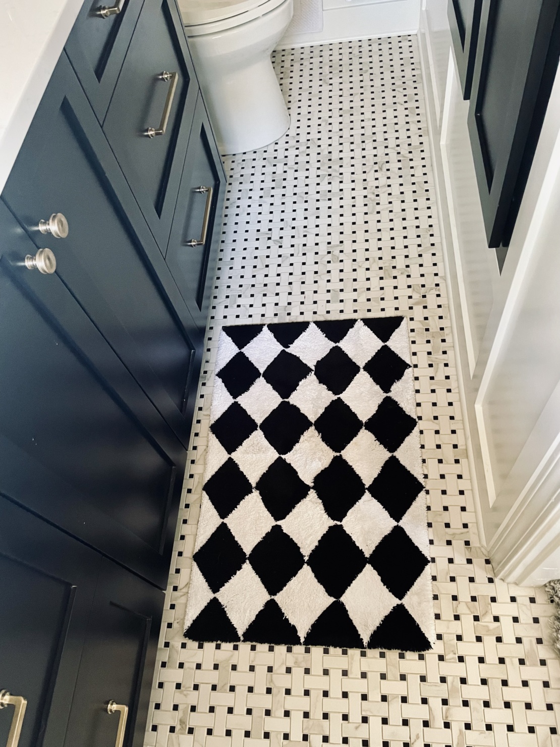 Lovely! I’m starting a bath reno myself and have also selected the black and white Basketweave floating. I chose marble (my splurge). Is your porcelain or marble. Might you link to it, or did I miss it? TIA!