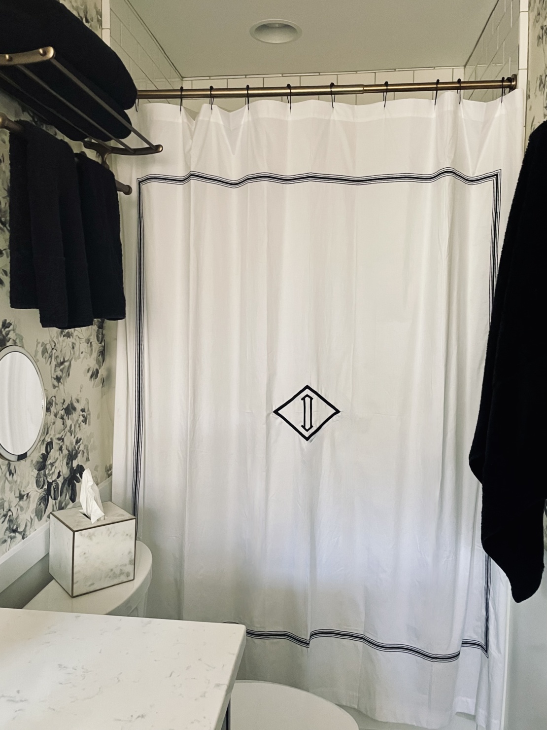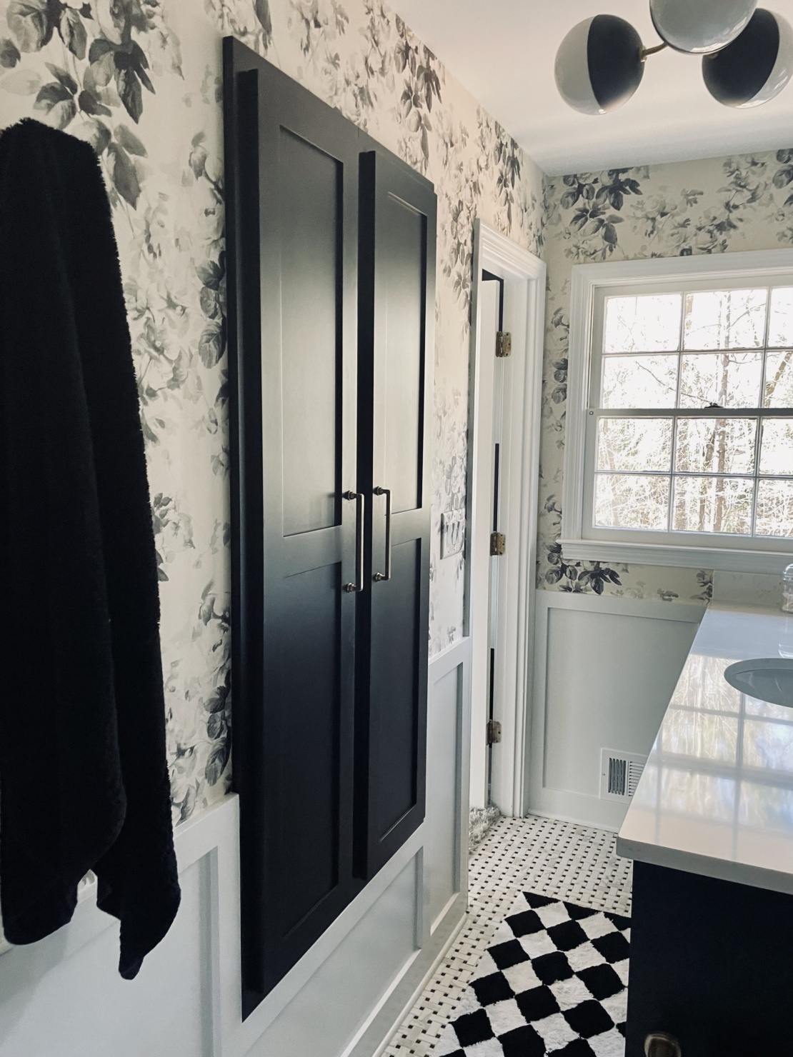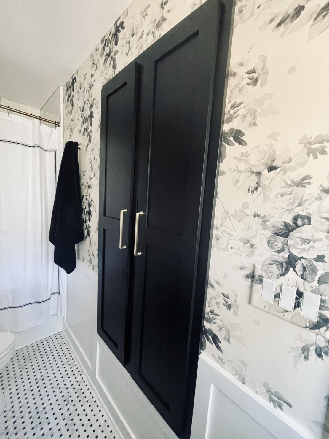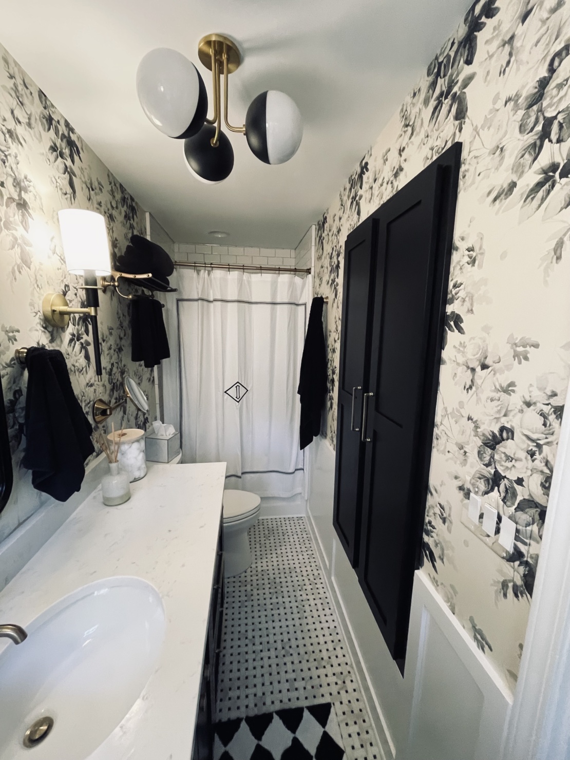 Ok, now for the tour of my renovated master bath. The black & white palette serves as the perfect foundation for the bathroom. This tried, and true color combo gave me a lot of freedom and flexibility in the direction I wanted to take everything else. (And it’s worth calling out specifically the floral wallpaper. It’s that perfect blend between traditional- and modernism that I really strove for in my entire remodel.)