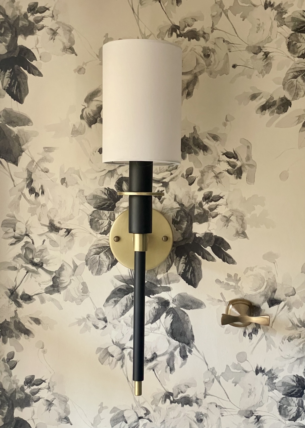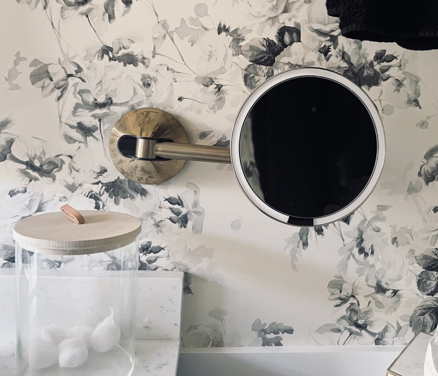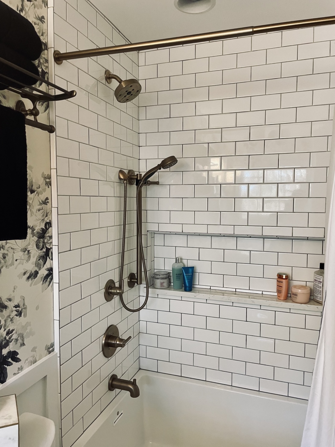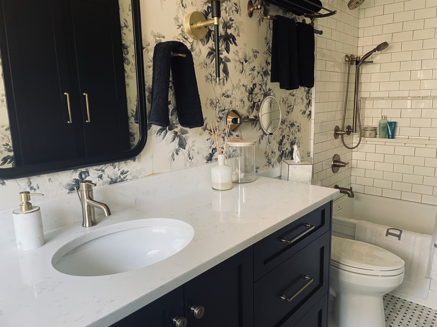 Ok, now for the tour of my renovated master bath. The black & white palette serves as the perfect foundation for the bathroom. This tried, and true color combo gave me a lot of freedom and flexibility in the direction I wanted to take everything else. (And it’s worth calling out specifically the floral wallpaper. It’s that perfect blend between traditional- and modernism that I really strove for in my entire remodel.)