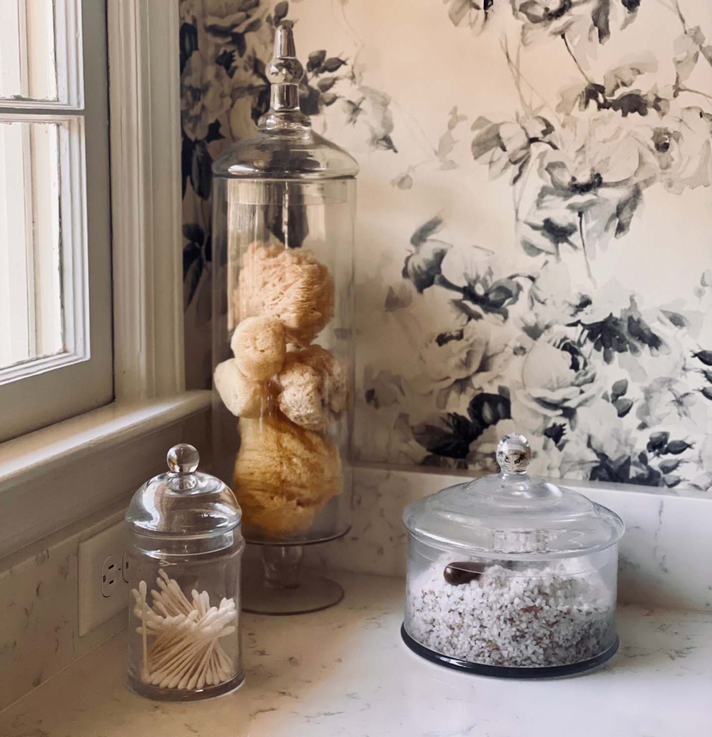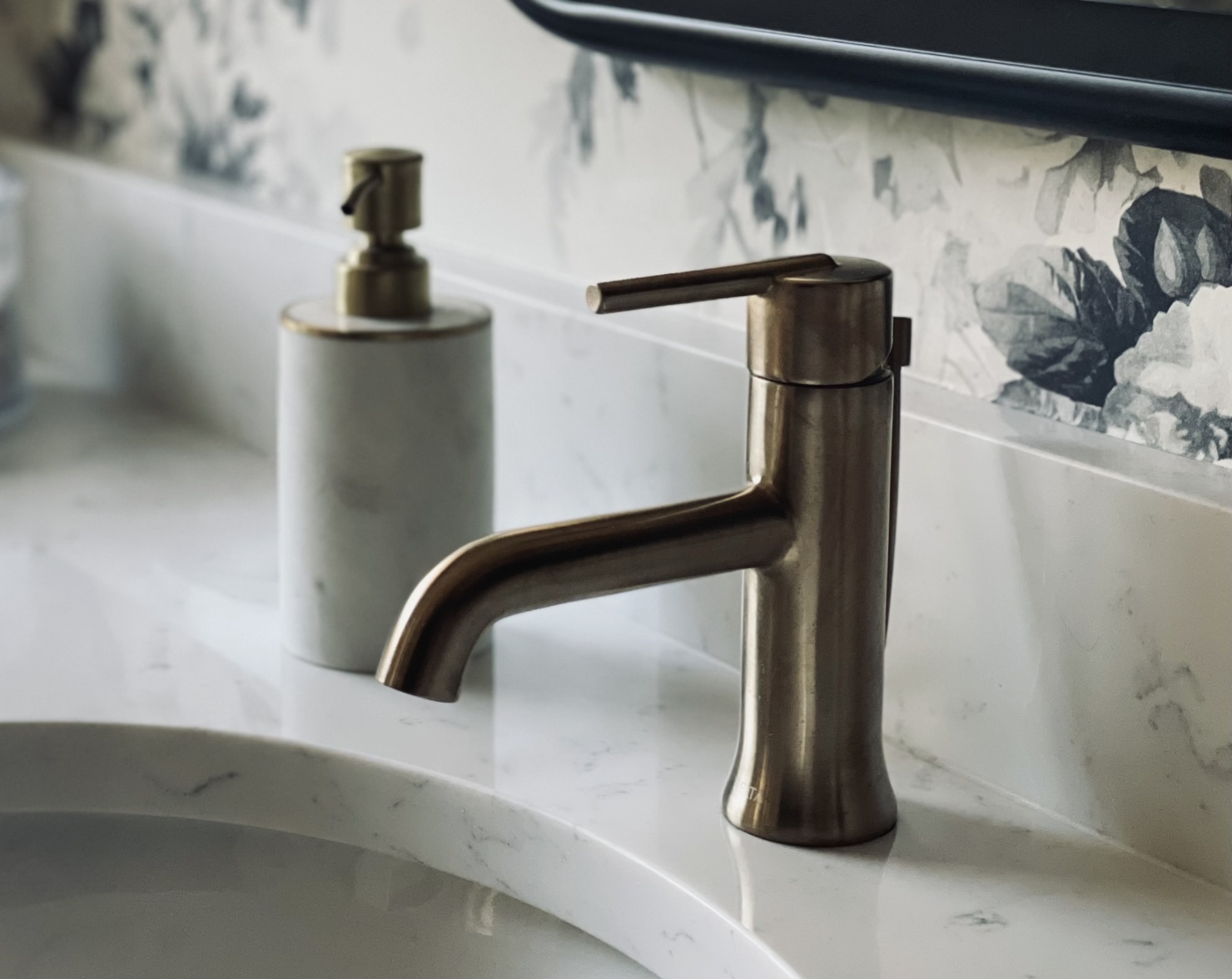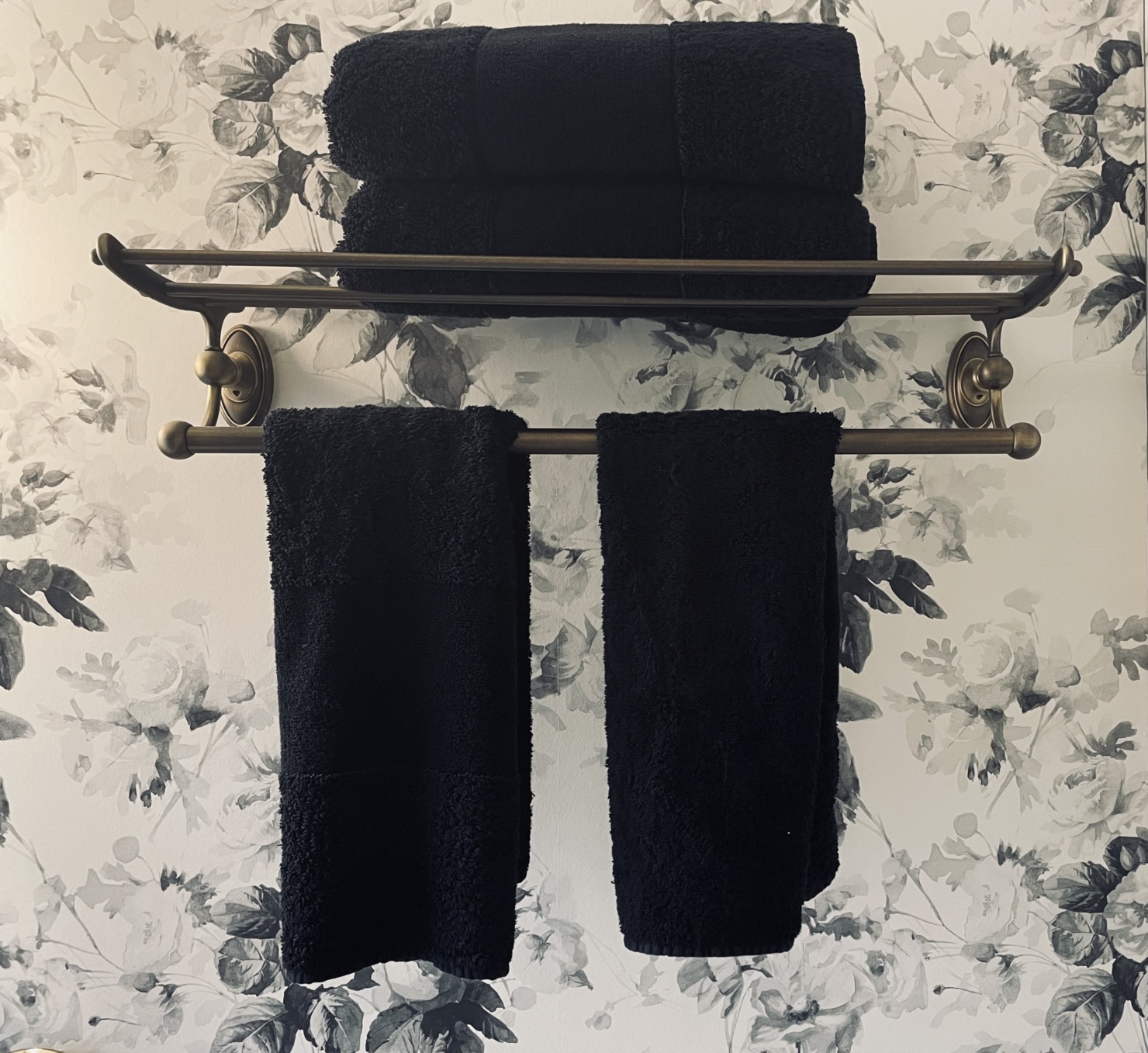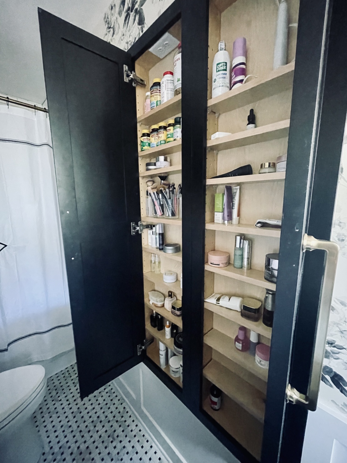 Ok, now for the tour of my renovated master bath. The black & white palette serves as the perfect foundation for the bathroom. This tried, and true color combo gave me a lot of freedom and flexibility in the direction I wanted to take everything else. (And it’s worth calling out specifically the floral wallpaper. It’s that perfect blend between traditional- and modernism that I really strove for in my entire remodel.)