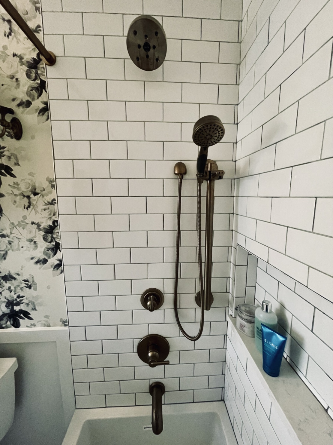 - All of the fixtures, including the sconces, faucet, showerhead, and slide bar, are a sort of antique brass. They give the room just the right amount of pop.