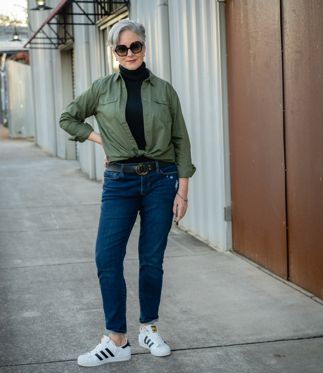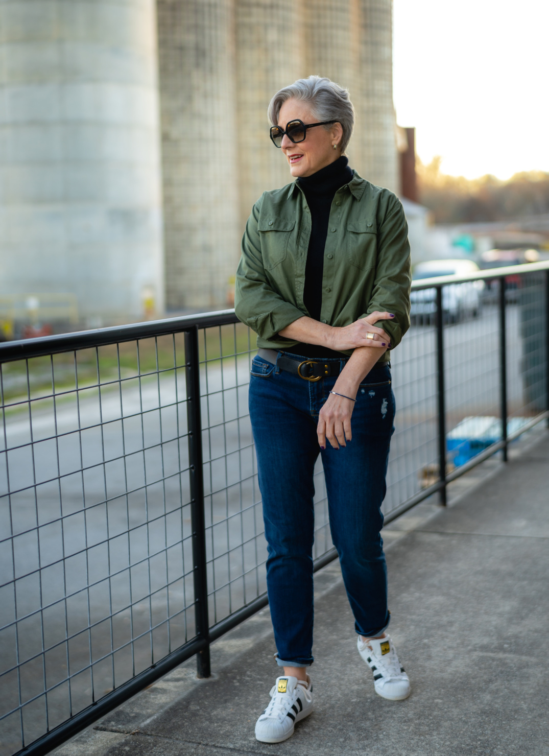 Denim (Frame) | Black Turtleneck (Banana Republic) | Green Shirt (old J.Crew similar) | Belt (old Ralph Lauren similar) | Sneakers (Adidas) | Earrings | Watchband | Caviar Bangle