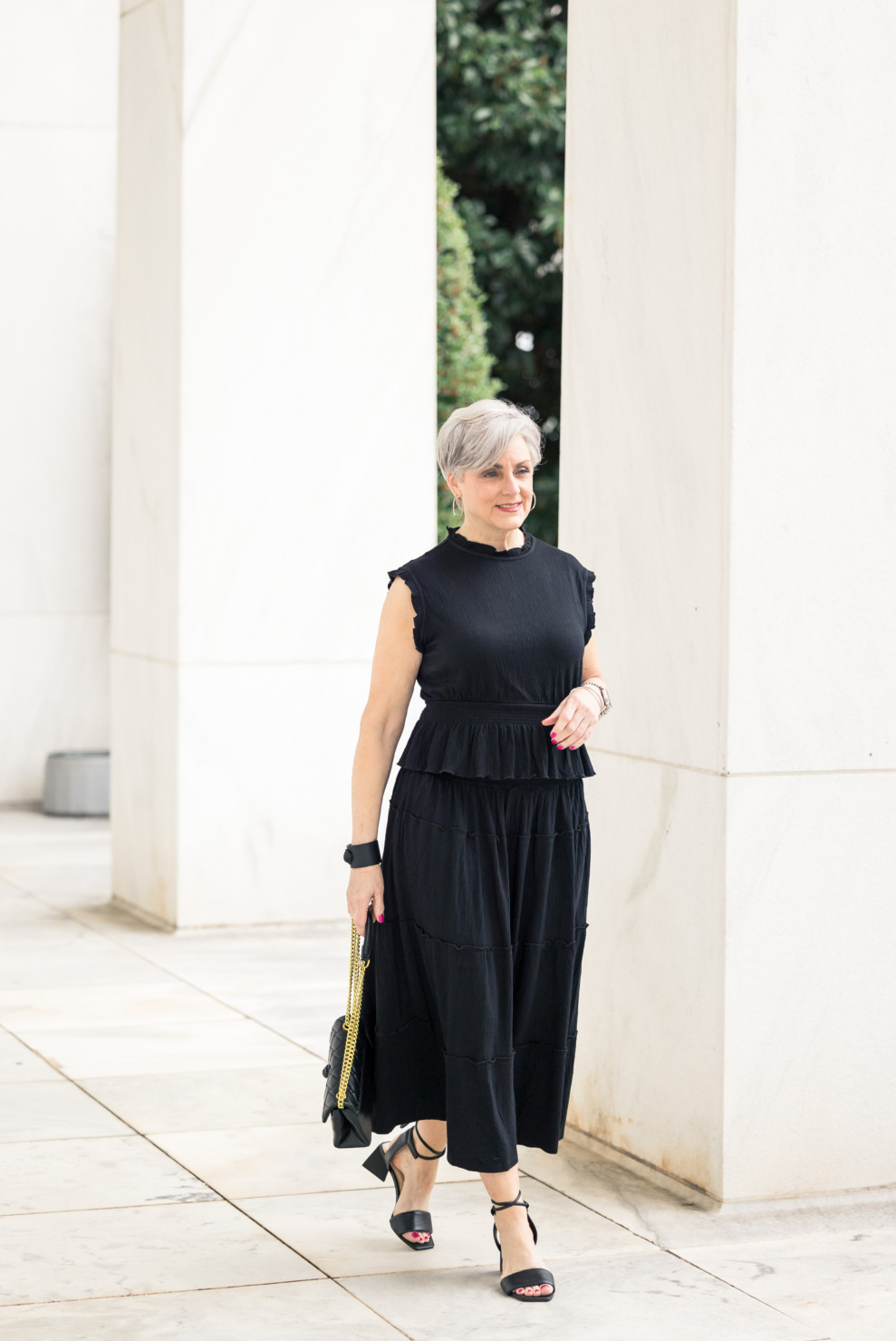 For our first style today, I’m pairing a black cap sleeve top with a black ruffle smocked skirt. Both are from Scoop available at Walmart. To dress this outfit up, I went with a pair of black strappy sandals from Vince Camuto. With the country opening back up again, I imagine many of you are spending evenings out again. This is the perfect outfit for a Spring night out.