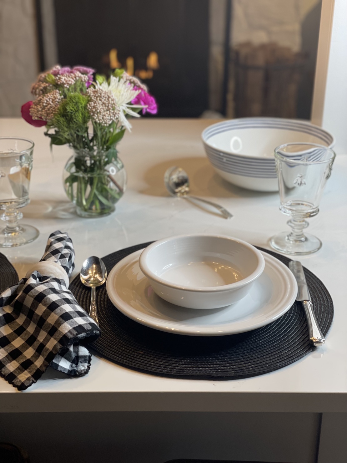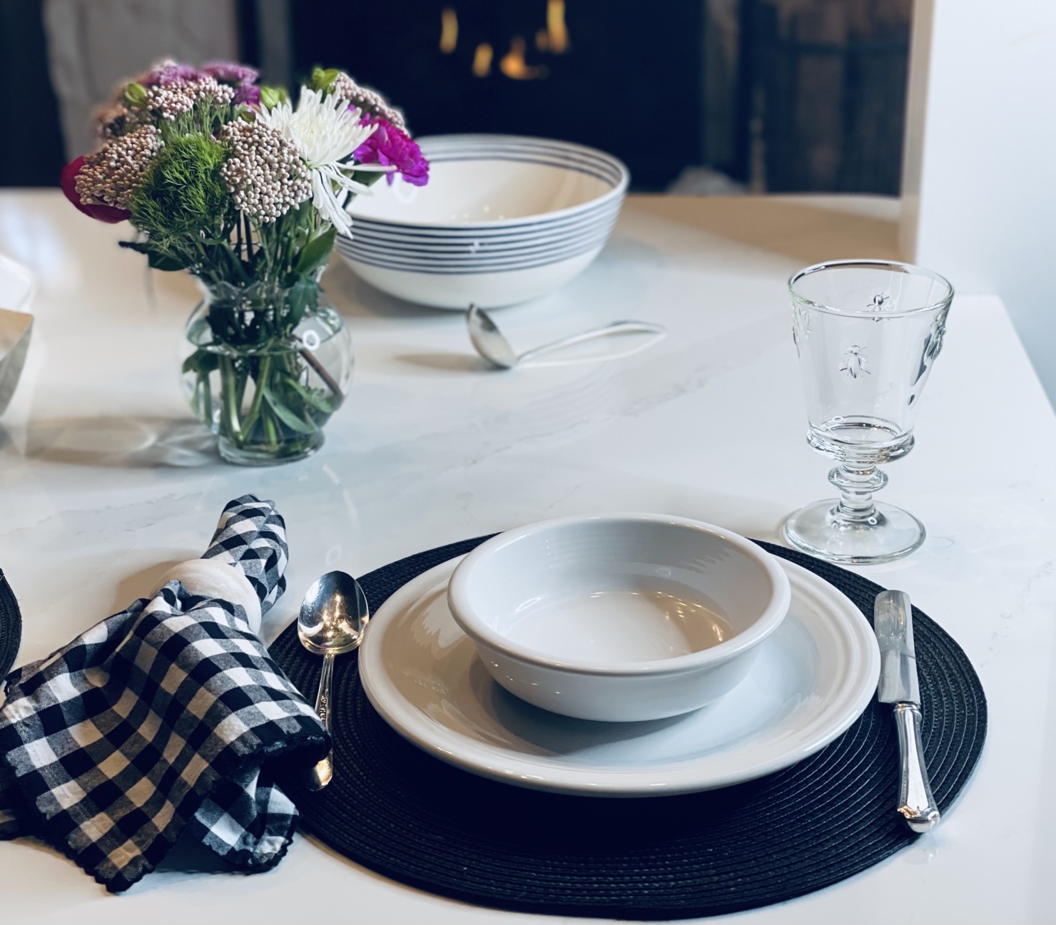 placemats | napkins | flatware | bowl | plate | glass | serving bowl | ladle