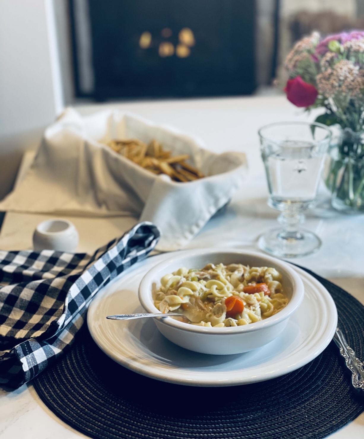 Fridays with Oscar is always about the celebration of simplicity and comfort. Since it’s Friday, I chose a casual outfit to kick off the weekend. Fridays are always about casual ease, whether it’s what I wear or what I eat. Today, I’m sharing a quick and easy version of chicken noodle soup and a refreshing, healthy mocktail instead of the usual cocktail. So come on in and stay awhile, even if it’s only virtually. And I do love to whip up a cocktail to sip and savor and enjoy come five o’clock.