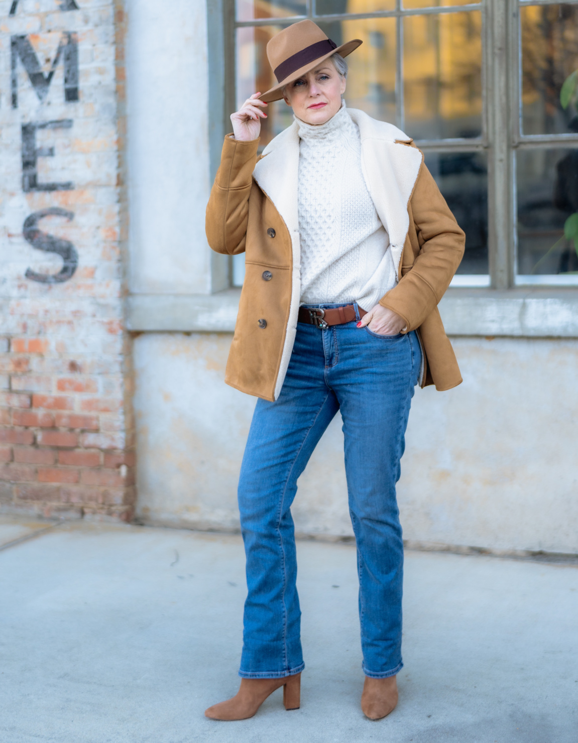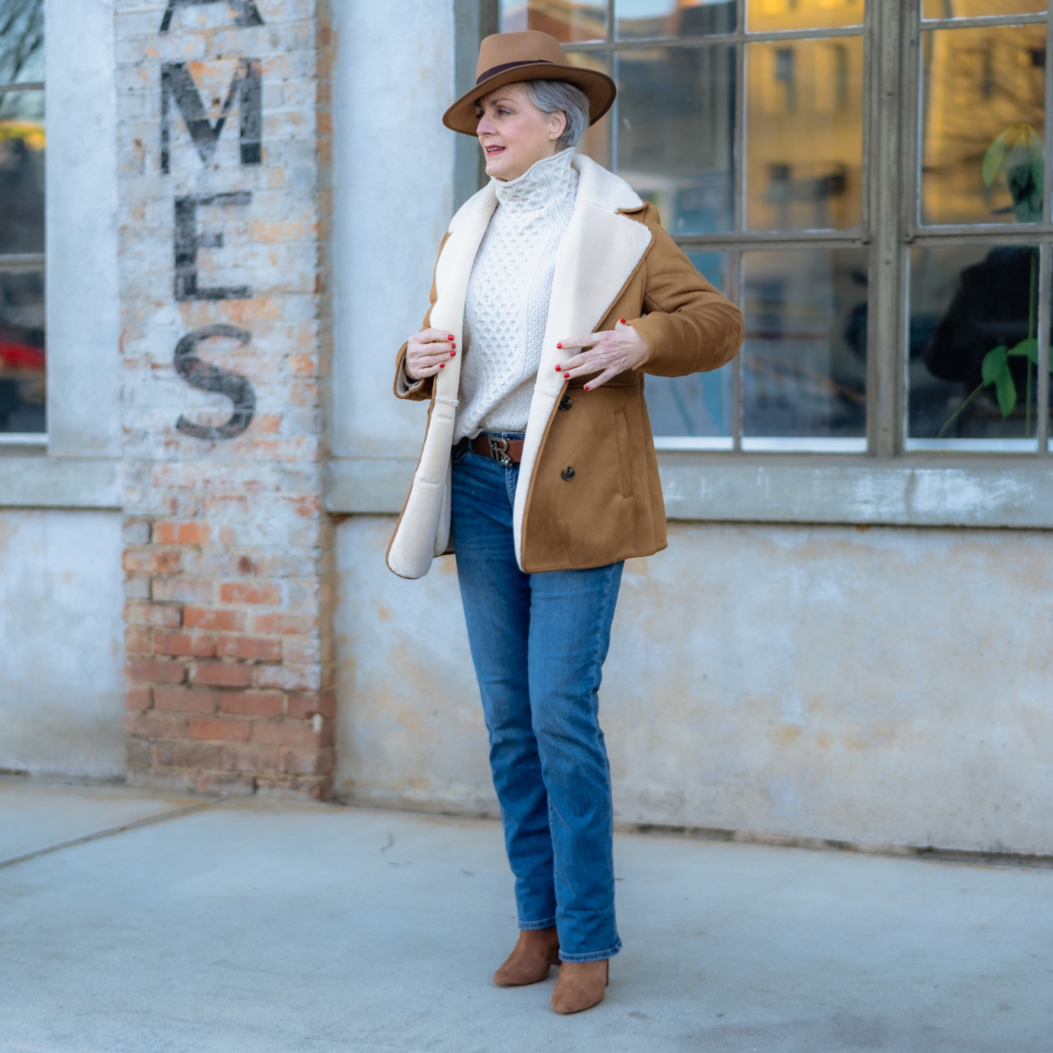 Faux suede sherpa jacket (similar ) | similar 2 | cable-knit sweater (Vince) | similar | similar 2 | denim (Ann Taylor) | boots (Banana Republic) | wool fedora | handbag (Patricia Nash)