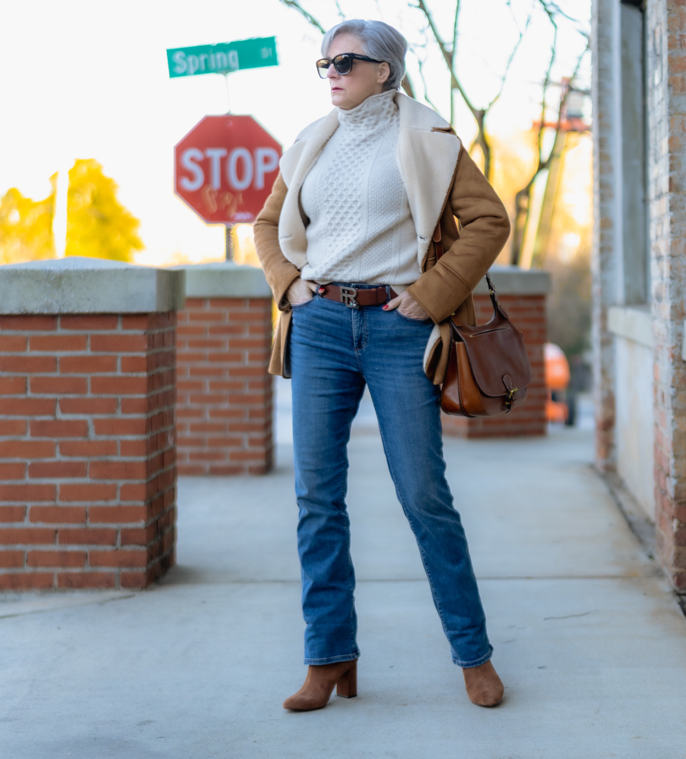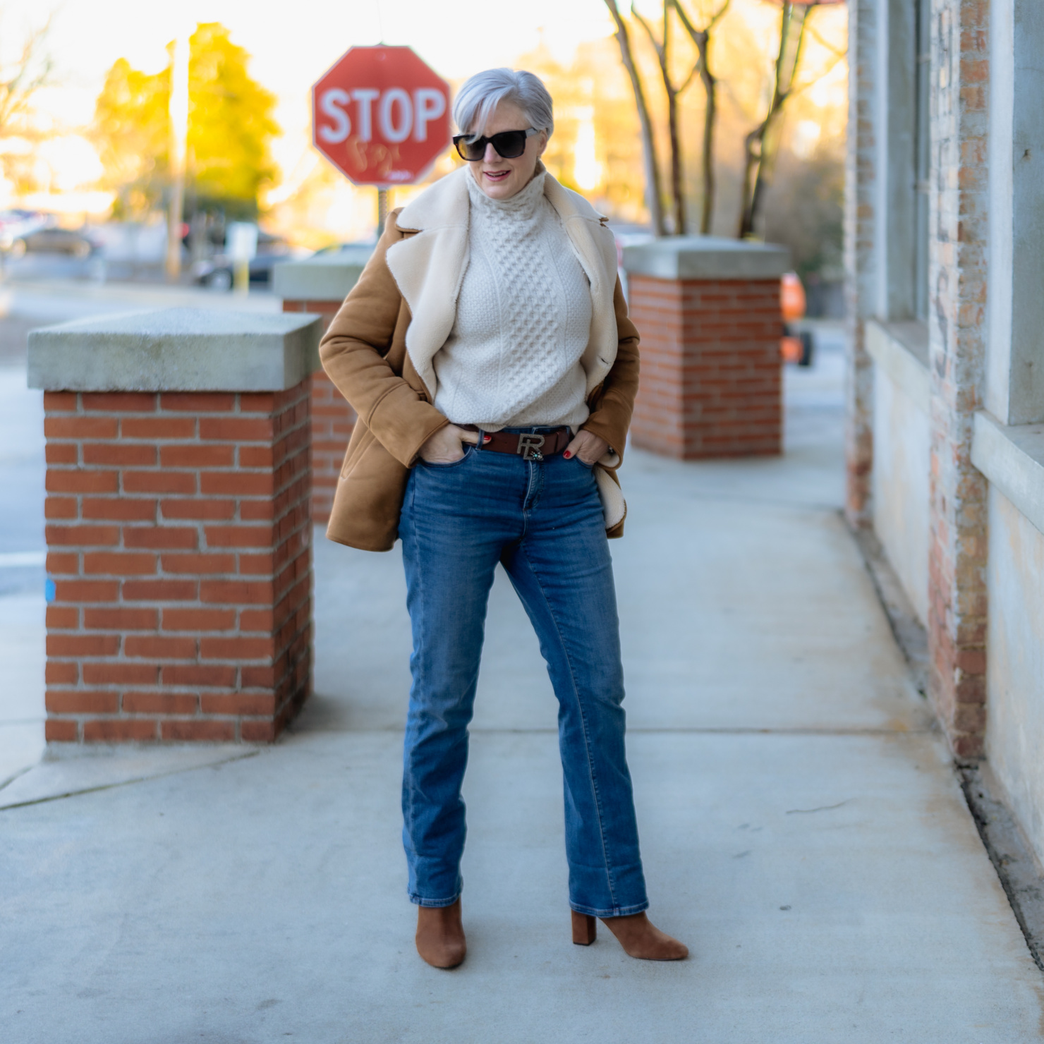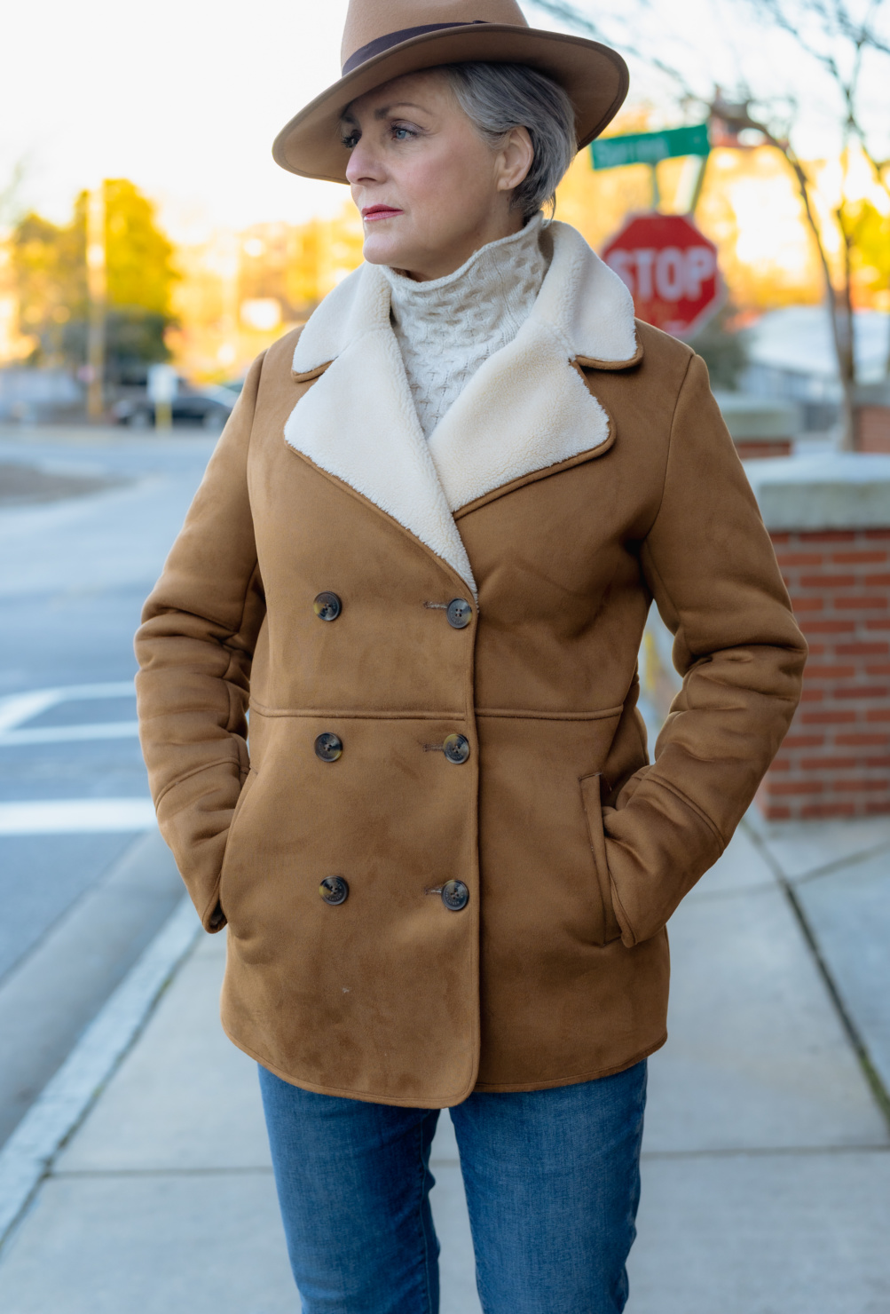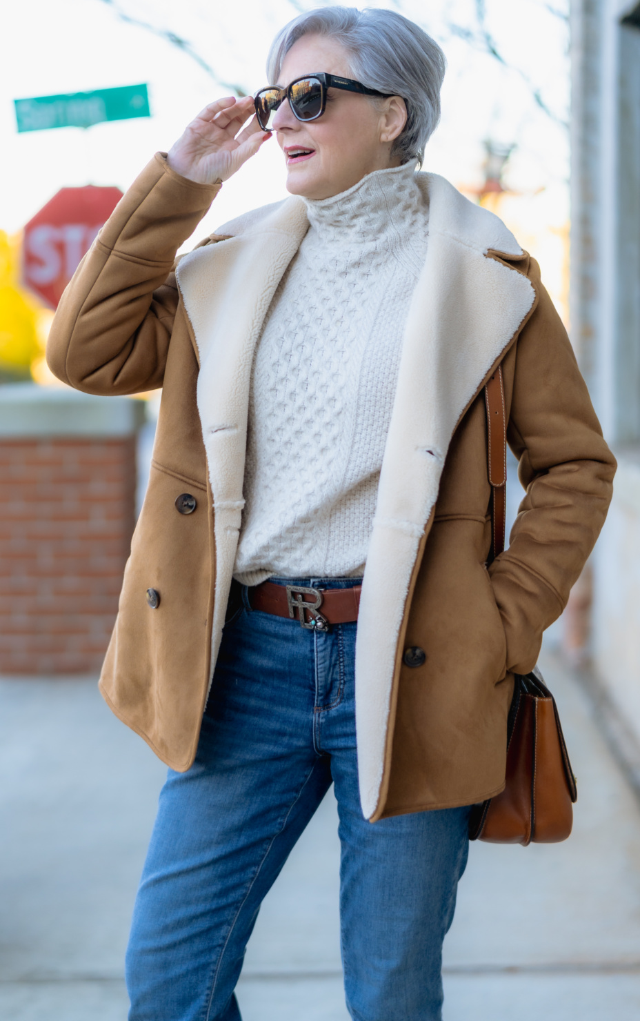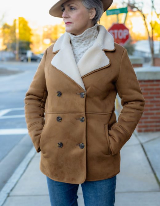 Faux suede sherpa jacket (similar) | similar 2 | cable-knit sweater (Vince) | similar | similar 2 | denim (Ann Taylor) | boots (Banana Republic) | wool fedora| handbag (Patricia Nash)