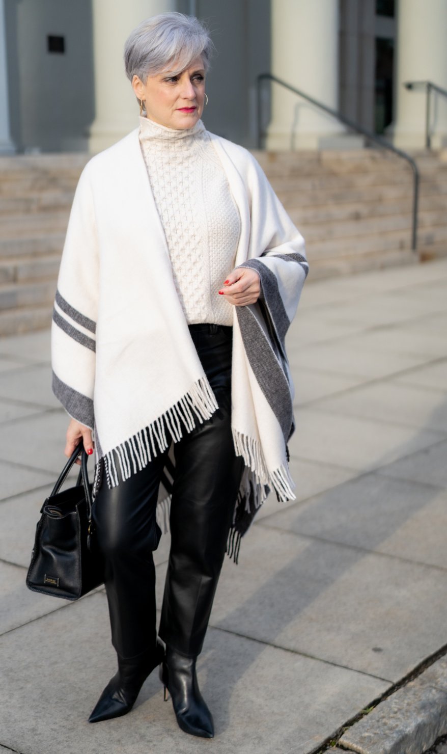 I absolutely love ponchos and have worn them for years on the blog. Today’s ruana wrap is from Banana Republic. I’ve paired it with a cable knit sweater (old Vince similar here and here), which I featured last week with a suede jacket. These faux leather trousers are from Ann Taylor and work as the perfect neutral backdrop for the poncho.
