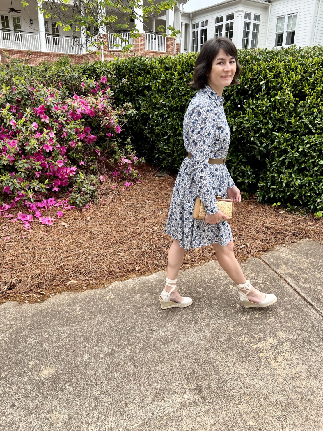 J.Crew Factory Floral Shirtdress | Canvas Ankle Wrap Espadrilles | J.McLaughlin Wood and Cane Clutch | (Similar) Belt Option 1 | (Similar) Belt Option 2 | (Similar) Belt Option 3