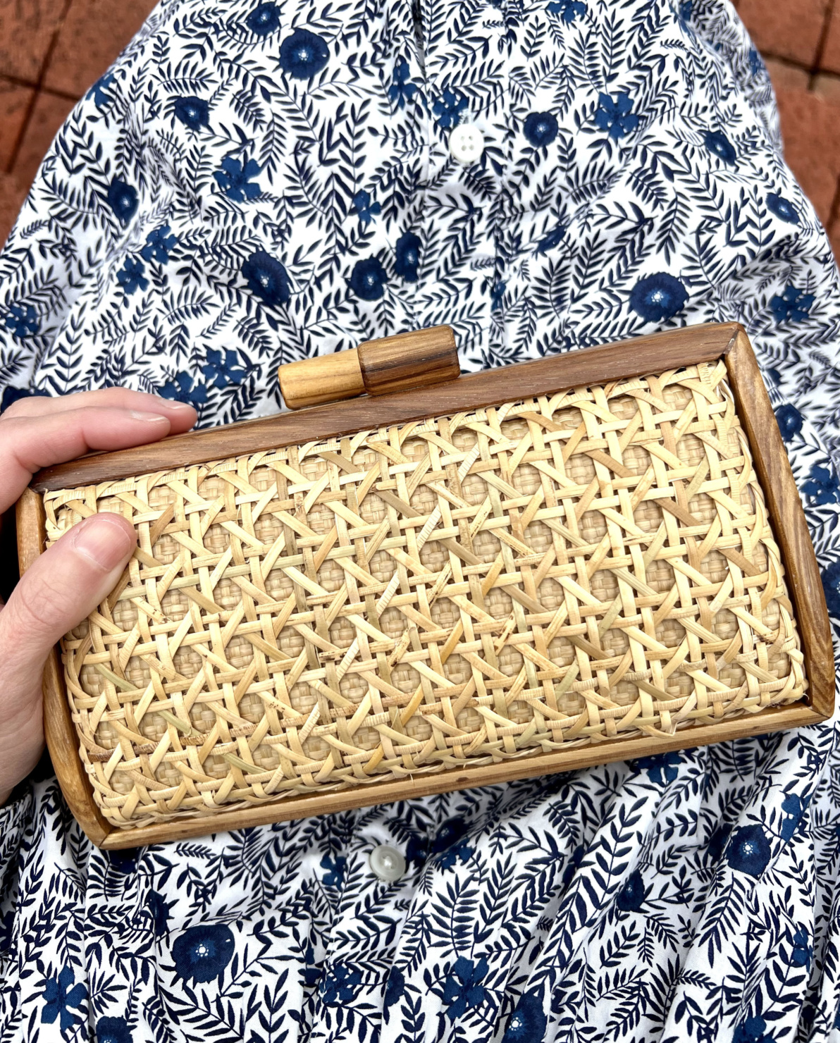 I love the wood frame of this clutch. The wood adds such a great natural look and feel to any outfit. Beautifully made and perennially on trend for summer, I know this wood and cane clutch will see years of use.