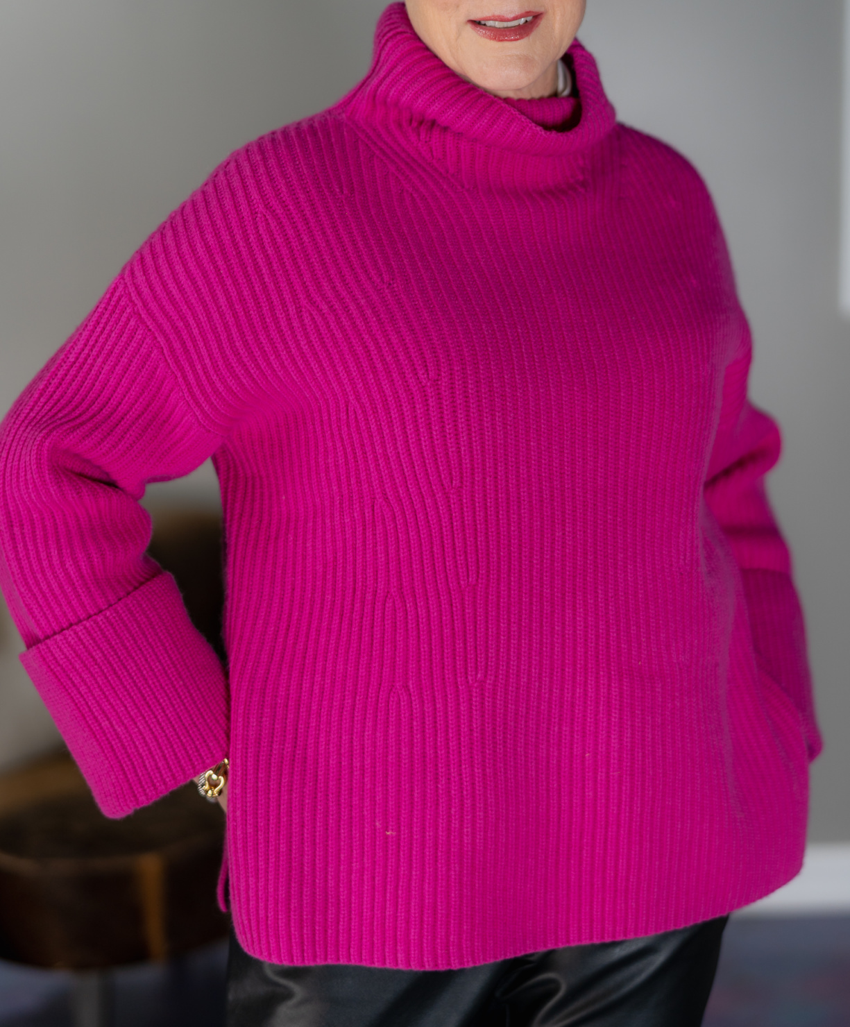 Today, I’m highlighting an oversized merino-cashmere sweater from Banana Republic. Super soft and super comfy. And that’s what winter at home is all about, right? The sweater comes in three colors: ivory, navy, and pink. I chose pink because like I said, I’m feeling bold today. I’ve paired it with a pair faux leather pants (similar) and lug sole Chelsea boots. It’s a really simple combo that packs a punch. If you’re not feeling the leather pants, not to worry.