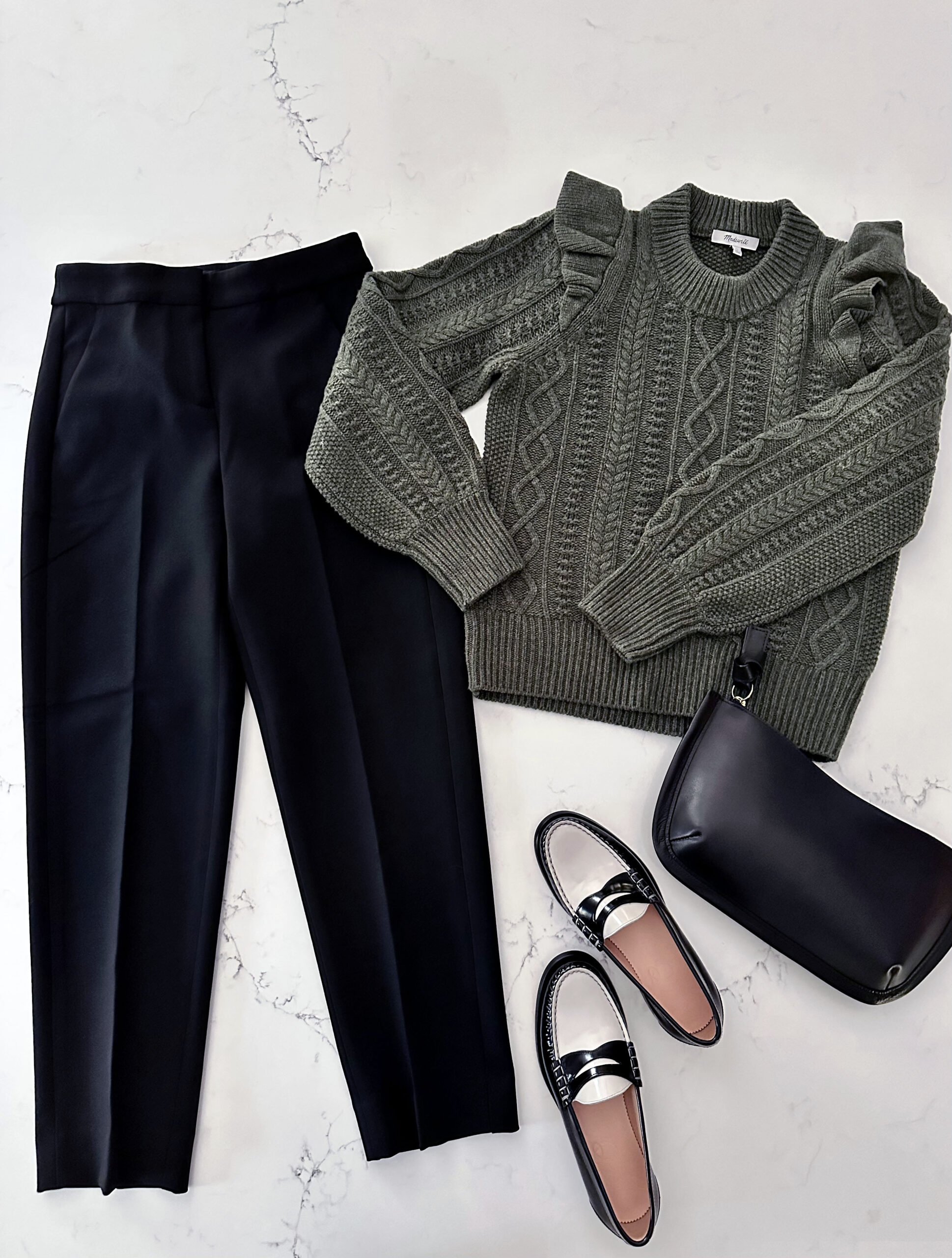 Ruffle Cable Knit Sweater (Belk) | Kate Straight Leg Pant in Four Season Stretch (J.Crew) | Sydney Clutch (Madewell) | Rowan Penny Loafers (J.Crew)