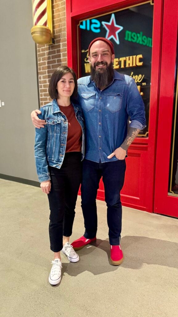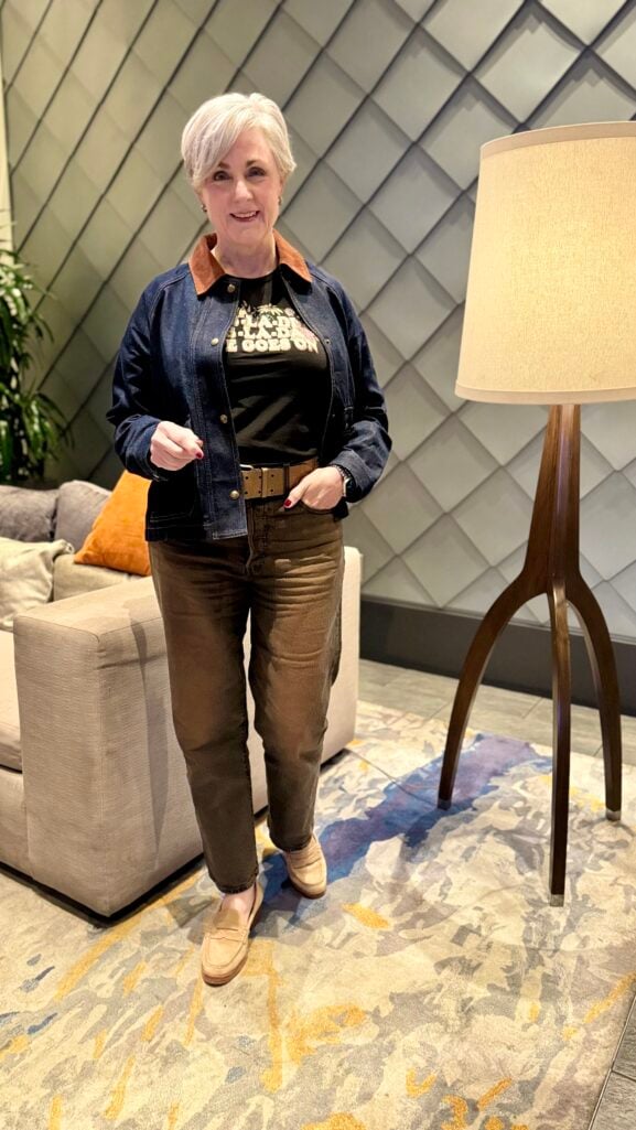 I wore a graphic tee with a cheeky Beatles nod — “O-bla-di, O-bla-da, life goes on” — tucked into my Levi’s Ribcage Jeans (the high rise is perfection). On top of that, my Madewell Trapeze Denim Jacket, with its corduroy collar, kept the look casual yet pulled together. For comfort, I slipped on suede loafers — stylish enough for cocktails, practical enough for concrete floors.
