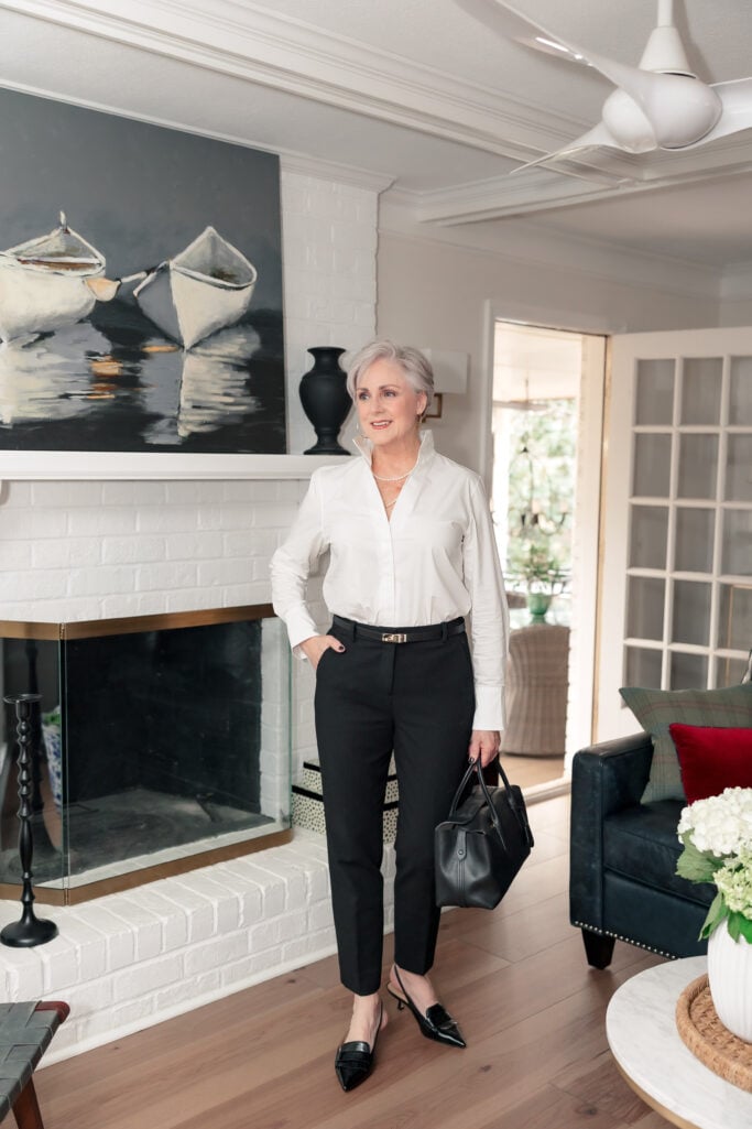 Beth’s Style Tip: The collar does the work here. Make sure it’s pressed and standing — it lifts your whole face and gives the outfit structure. A limp collar changes everything, and not in a good way.