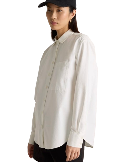 This one has a cult following for a reason. The washed cotton is incredibly soft out of the package — it feels like you’ve owned it for years. The relaxed fit is flattering without being oversized, and the curved hem looks equally good tucked or untucked.