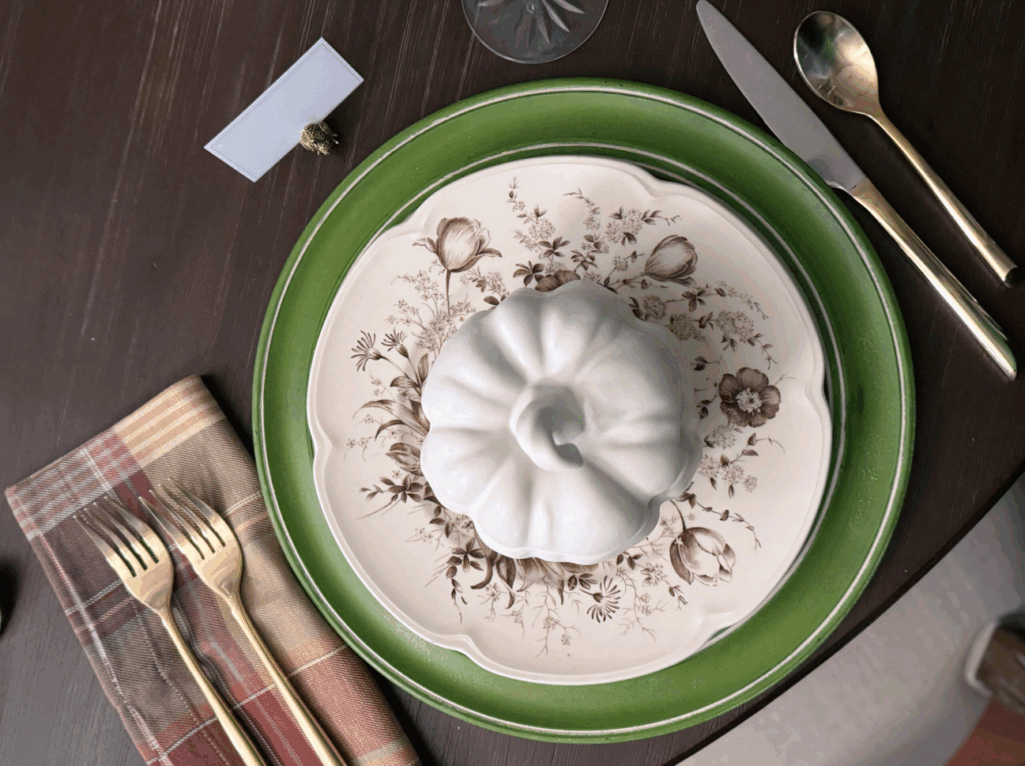 For the past couple of years, I’ve loved experimenting with fall colors and botanicals with through festive plates and linens. Check out my post Thanksgiving Tablescapes of Past and Present for more inspiration and a fun look at how my style has evolved over time.