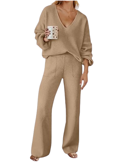 Part pajamas, part lounge set, this knit option feels polished enough for a lazy Sunday at home. The soft texture adds warmth and sophistication to your routine.