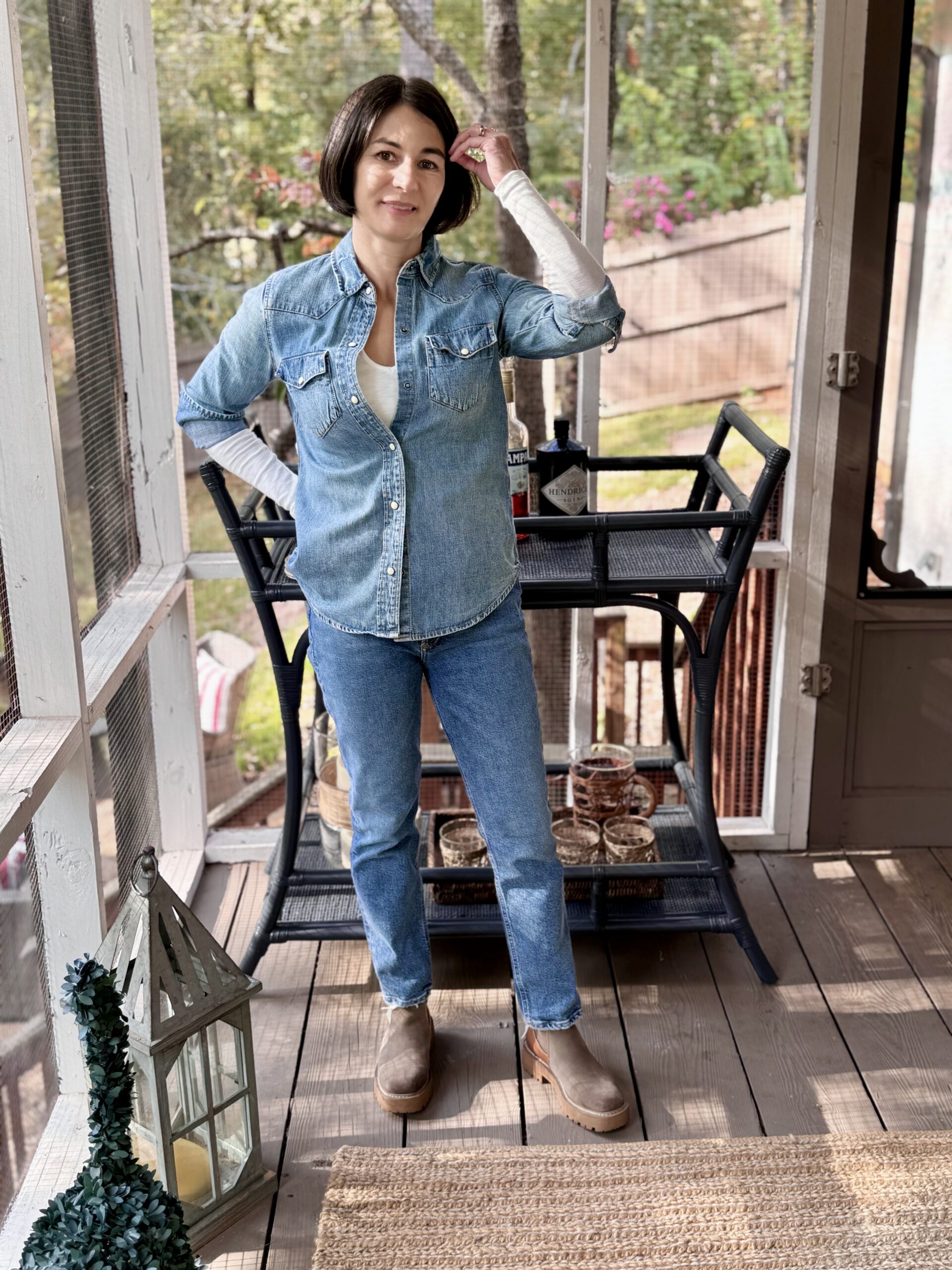 Kelly’s Outfit: Agolde Jeans | Split-Neck Long Sleeve Tee | Denim Western Shirt | Laguna Chelsea Boot | Backcountry Belt