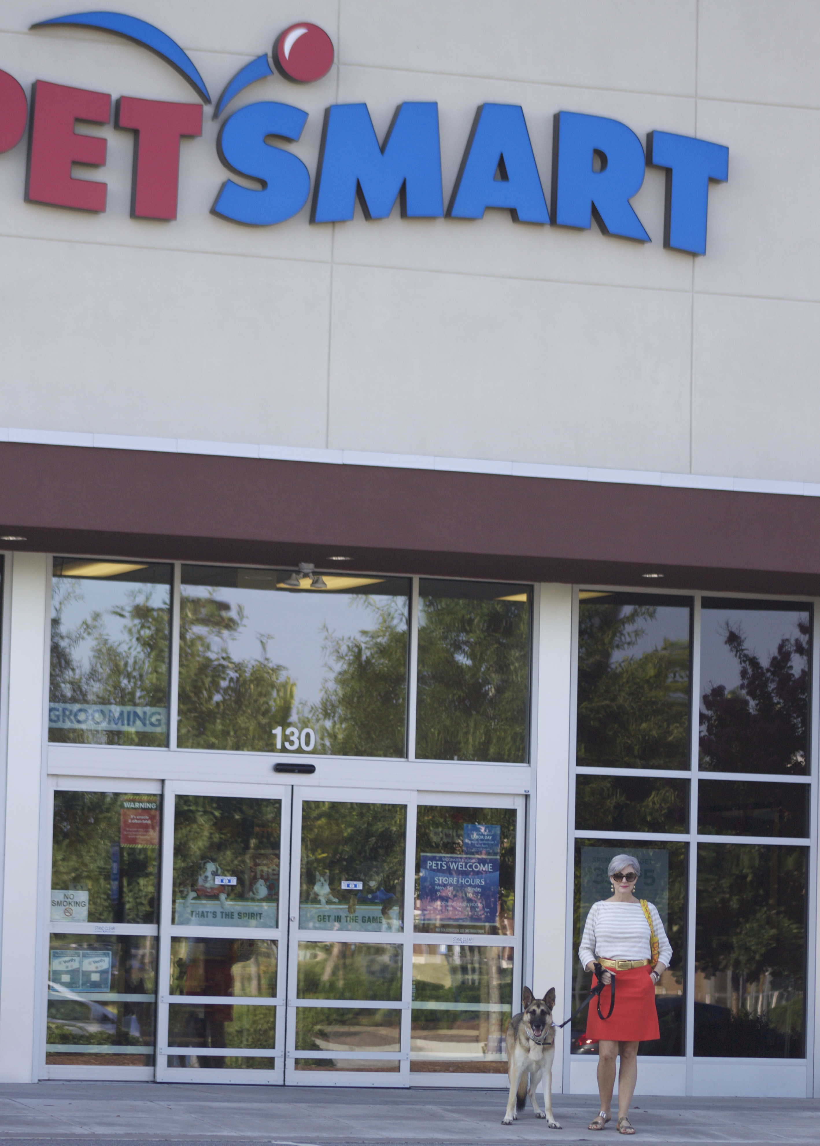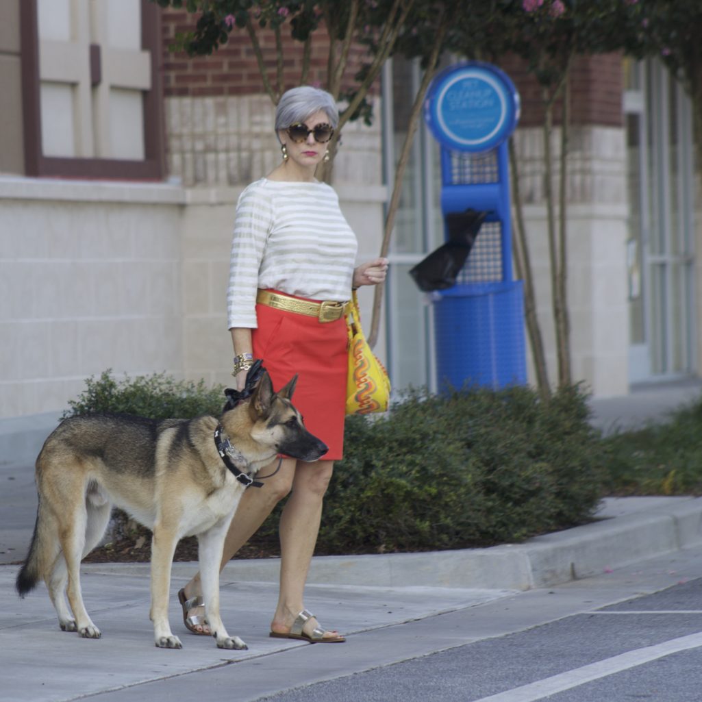 it’s fridays with oscar, and we’re off to the pet store to find a special treat for oscar mayer and a cup of coffee for me. i may even splurge for a cafe mocha seeing as it’s my birthday. yup, i’m celebrating my 58th today. and i’m counting my blessings as i have three healthy kiddos, a fab photographer a.k.a. mr. style who i spend oodles of time with as we venture off on photo shoots near and far. and oscar by my side. as you can see from the photos, he’s more than excited to head on in and select his favorite treat – a bully stick. what do you think about this bright orange skirt? i’m loving this shade as it’s perfect for summer but will transition nicely into fall. stay tuned to see how it’s styled in future weeks. i’ve always been a big fan of orange paired with gold. so i’ve pulled out my metallics to give this ootd some zing. i almost always wear flats if i have a hemline above the knee but the star of the show today is this belt. what do you think? is there a new favorite in the rotation? you’ll have to wait and see…