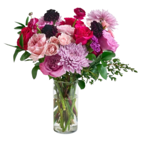 I set a simple Valentine’s table — festive without being over the top. Think pink glass plates, white dinner plates, blue linen napkins with ceramic napkin rings, and gold flatware. Each place setting had a little Valentine’s treat — a box of Sweethearts and a bag of Lindt Lindor truffles — because it’s the small touches that make a dinner feel special. A lush arrangement from Urban Stems of red roses, pink ranunculus, and lavender mums in a glass vase anchored the center of the table, and red polka-dot gift bags added a pop of fun. The whole thing felt celebratory and warm — exactly the way a Galentine’s dinner should.