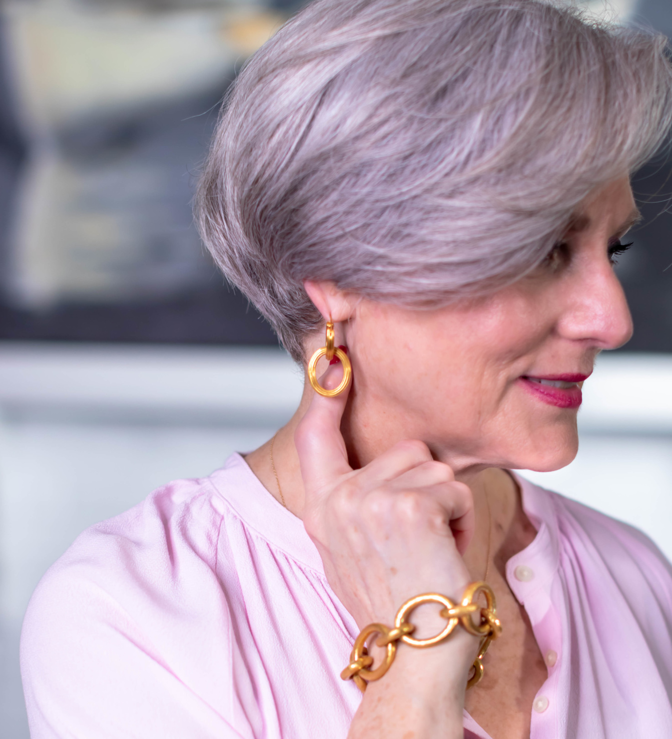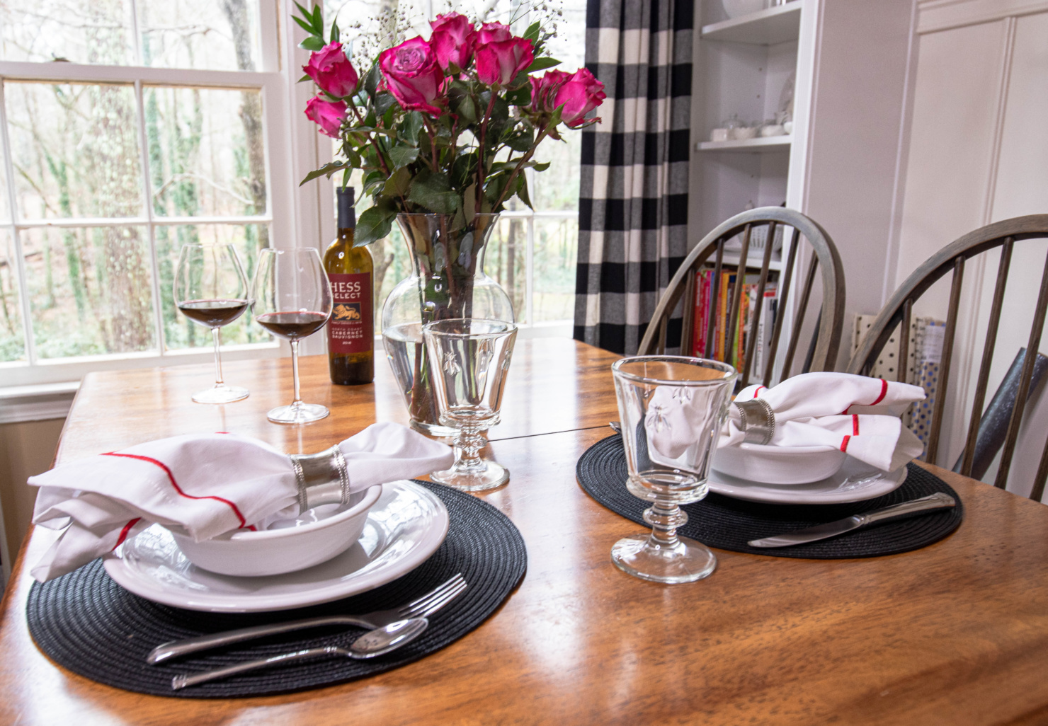 the soft, muted, blushing pink color of my blouse today is a nod to the romance of Valentines Day. keeping it casual for our meal at home, i have my grey denim back in action – a perfect complement to the muted tone of my blouse, grey denim is softer in color and in material.