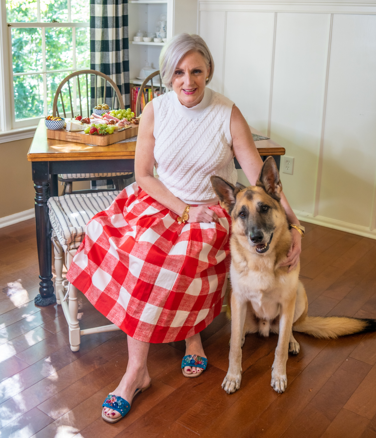 the large check gingham skirt makes a bold statement – it’s fun and playful, just perfect for spring and brightening my mood. my blue suede slides are a fun contrast to the red in my skirt. they are topped with colorful gem-like baubles and sparkles. their whimsy makes me smile every time i wear them. pax is here today, hoping for a tasty bite!