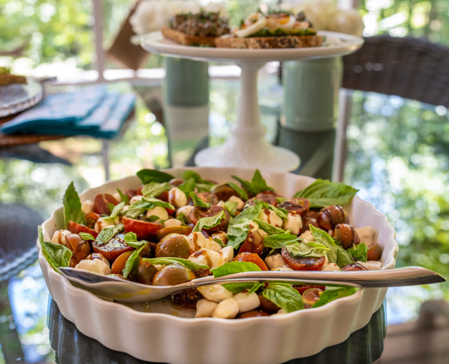 an easy caprese salad finishes the menu. using small heirloom tomatoes and mozzarella pearls makes it all come together so easily! some fresh basil leaves, a drizzle of olive oil and balsamic, salt and pepper – and that’s it!