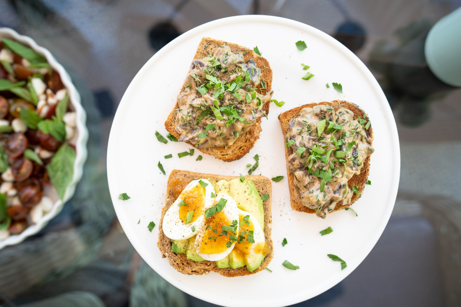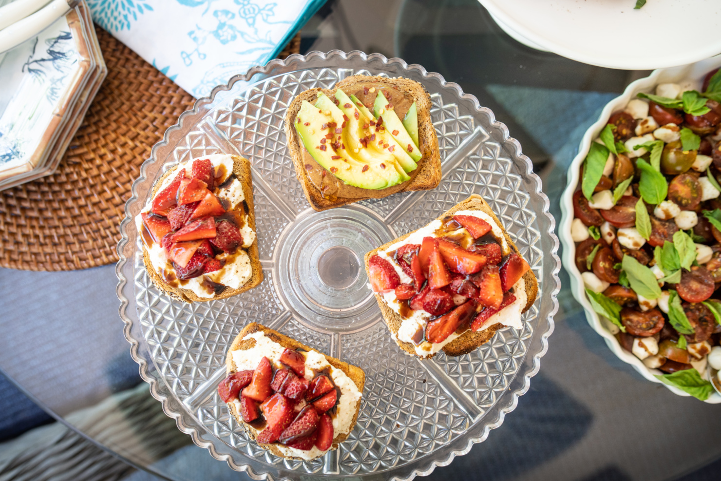 we have: strawberries and ricotta with black pepper and a balsamic drizzle. avocado toast two ways: almond butter with avocado, red pepper flakes, sea salt and a honey drizzle; and avocado with hard-boiled egg and a peach jalapeño jam drizzle. and lastly, creamy mushrooms with fresh parsley and thyme.