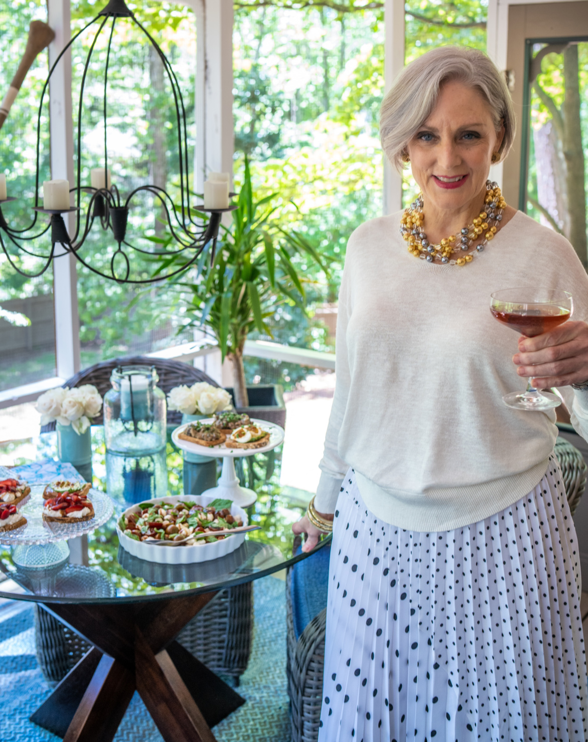 for our special brunch i wanted to dress up a bit. i have been loving the pleated midi and maxi skirt trend all year and this polka dot skirt is so light and airy, perfect for a warm spring day. keeping it light, i have an ecru-colored sweater. i love to mix creams and off-white with true white, it’s a semi-monochromatic look that is classic and elegant.