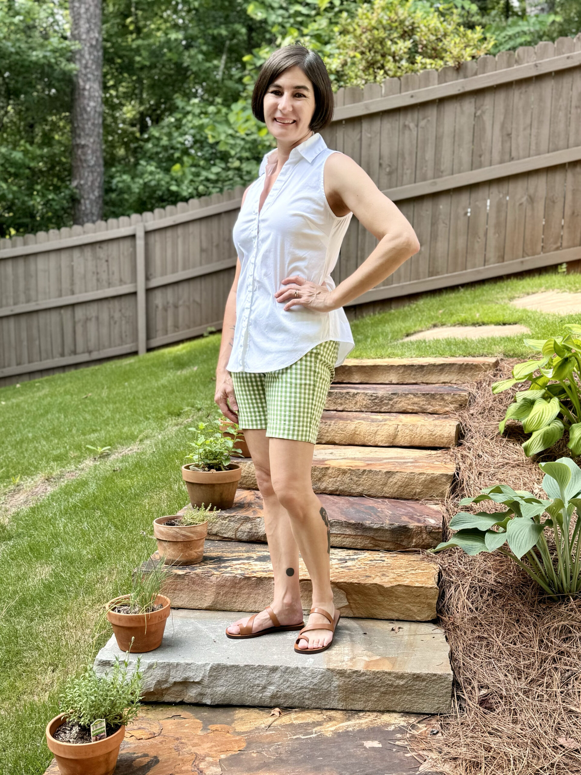 Kelly’s Outfit: Masie Shorts in Gingham | Sleeveless Essential Shirt | Gabi Asymmetric Slide