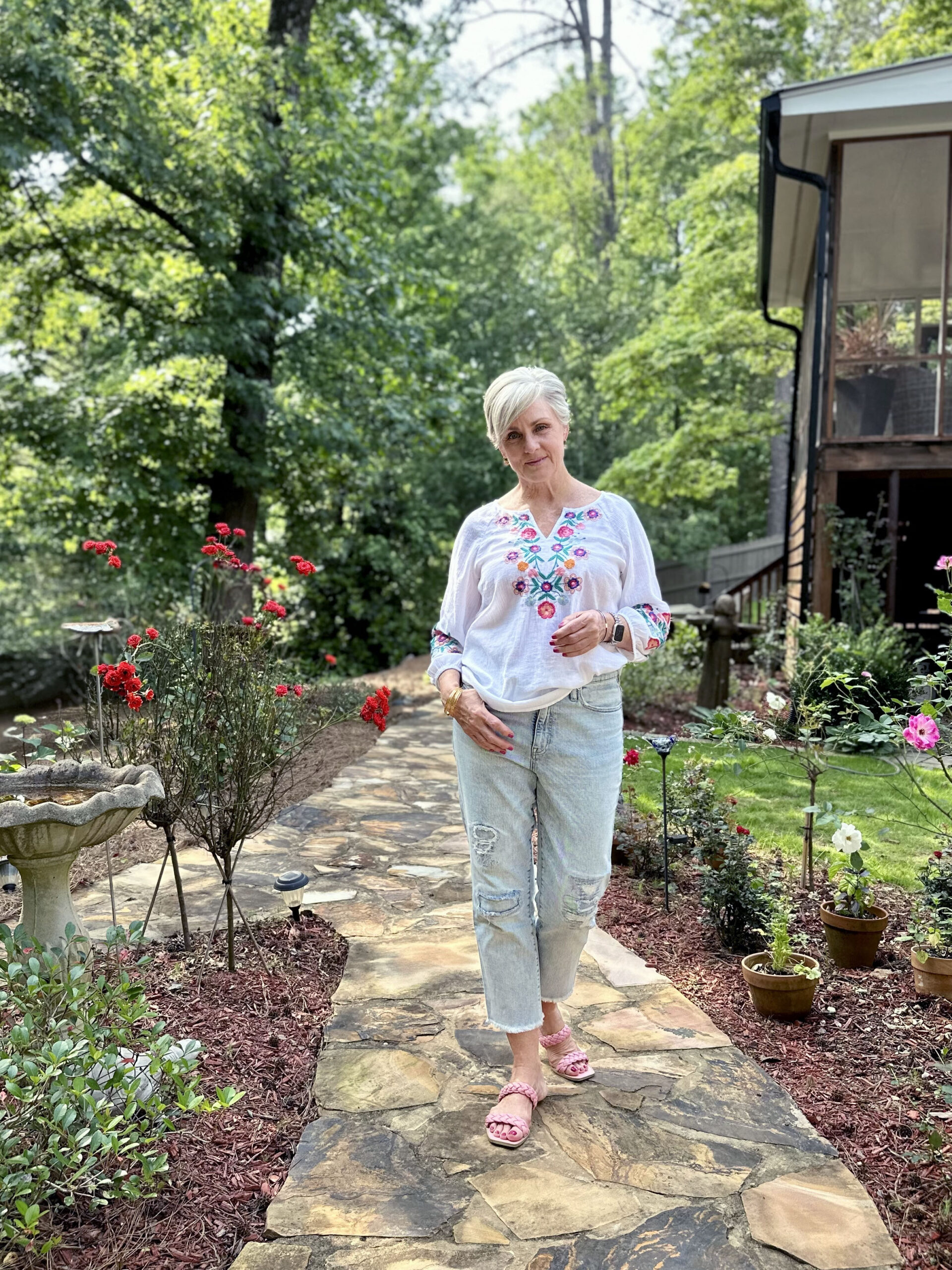 Today’s outfit is easy breezy with an embroidered gauze top from Talbots and light wash denim (old, similar here). A lazy summer day calls for a lazy outfit. Right?! A pair of pink sandals (old, similar here) is the finishing touch. All in all I’m ready for that Porch Swing.