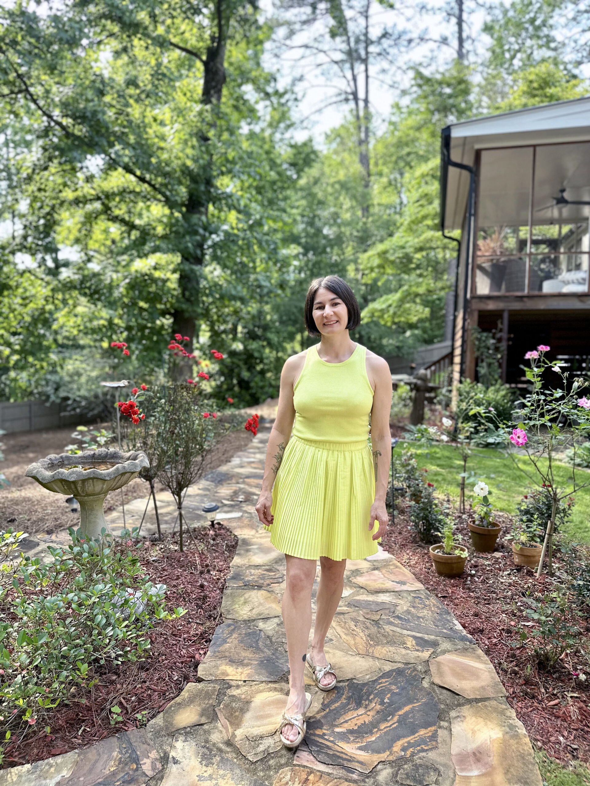 Kelly’s Outfit: Pleated Mini Skirt | Tencel Shell Top | Metallic Knotted Espadrille Slides