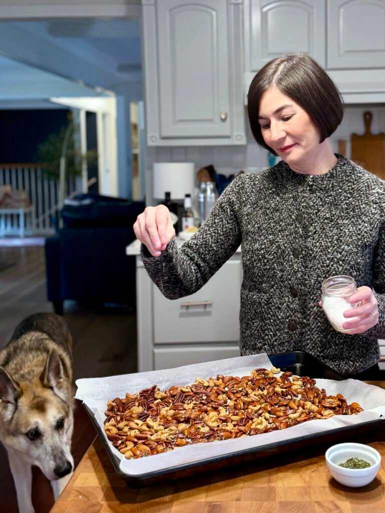 There’s something so satisfying about making your own spiced nuts — the aroma alone makes your kitchen smell like the holidays. With fresh rosemary, thyme, and just a hint of garlic and black pepper, they’re the kind of snack that disappears the moment you set them out. Even better? They come together in under 30 minutes and make a thoughtful homemade gift when packaged in a pretty jar. Oscar has been particularly interested in quality control this week, though we’ve had to remind him that these are decidedly not for pups.
