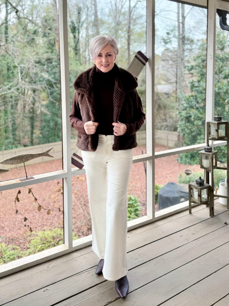 I’ve layered it over the Arlette Turtleneck, which provides the perfect base, and paired it with Weekend Collection Wide Leg Corduroy Pants from Ann Taylor in winter white. The look is polished but comfortable, and The Dimes Chelsea Boots in chocolate brown tie everything together beautifully. It’s my go-to formula for December entertaining: textured, tonal, and effortlessly elegant.
