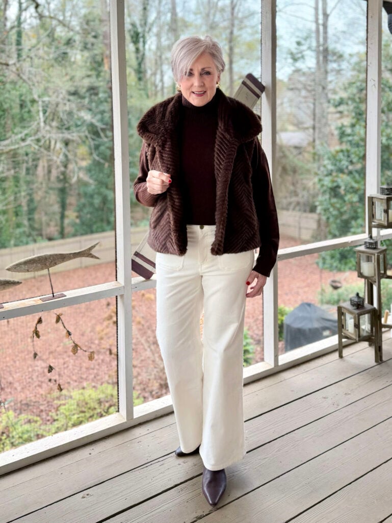 As we step into December, I’m all about luxe textures and neutral tones that feel festive without trying too hard. This Evereve Faux Fur Vest in rich brown is the kind of piece that instantly elevates everything — it’s cozy, sophisticated, and has just the right amount of drama for the holidays.