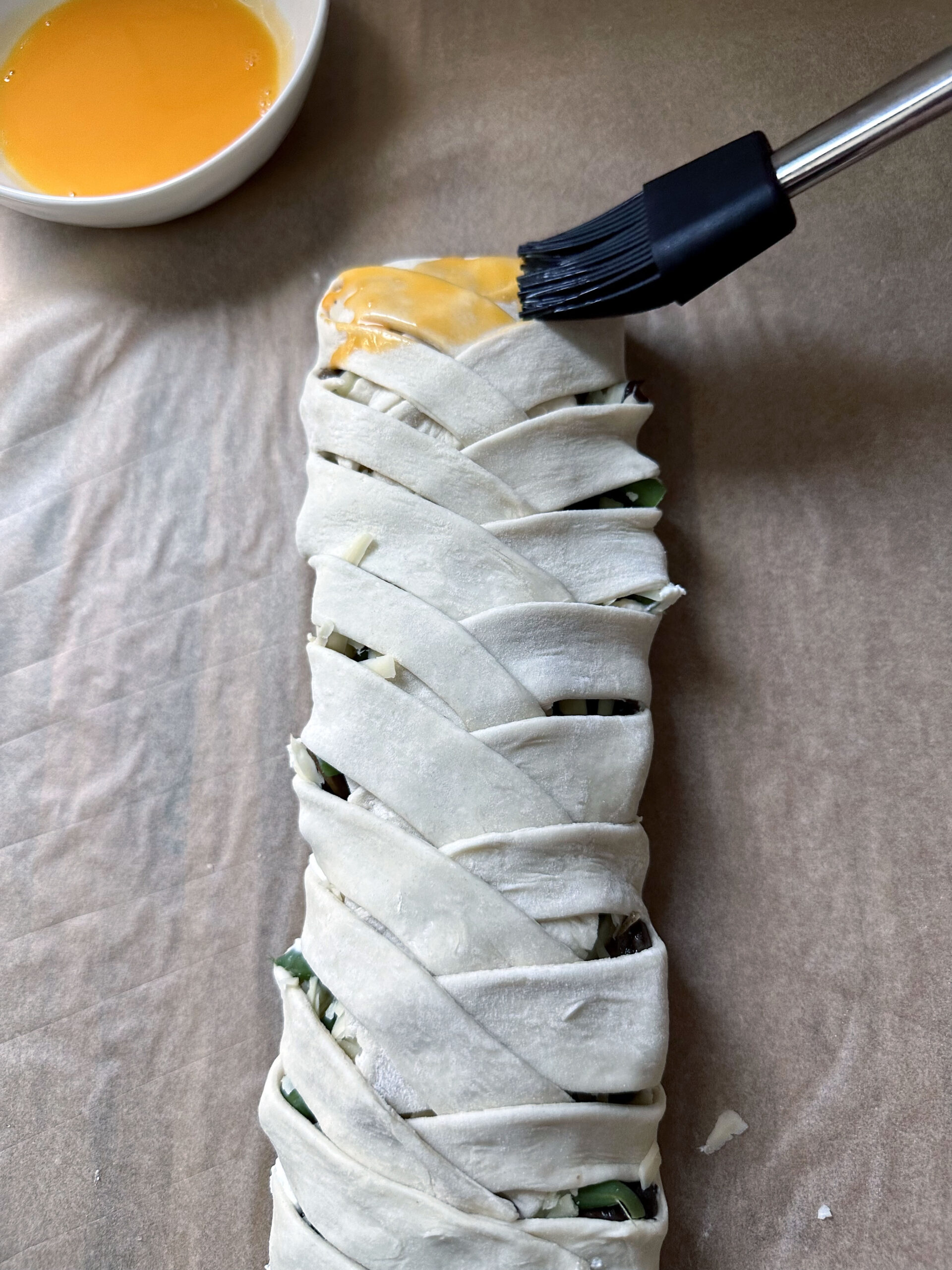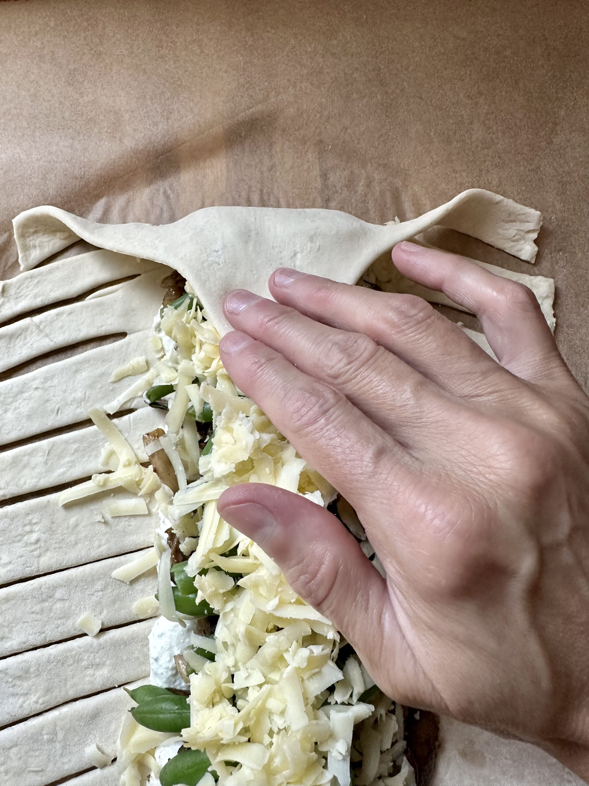 This is a great savory danish recipe with a beautiful presentation. Perfect for a light meal or appetizer, you can customize the cheese to what you like. The green bean and mushroom combination is great for fall.