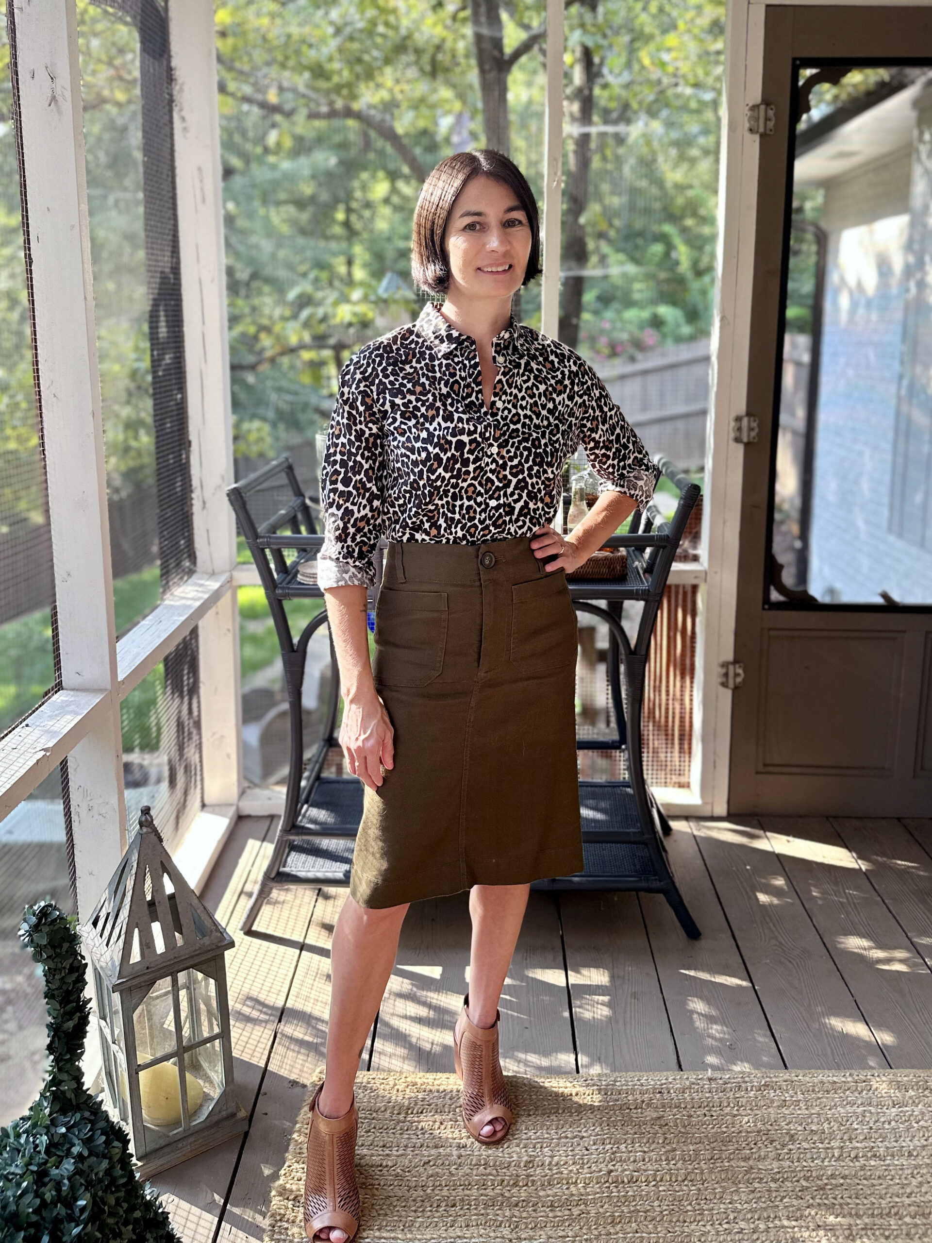 Kelly’s Outfit: Similar Animal Print Button Up | The Colette Skirt | Similar Open Toe Booties