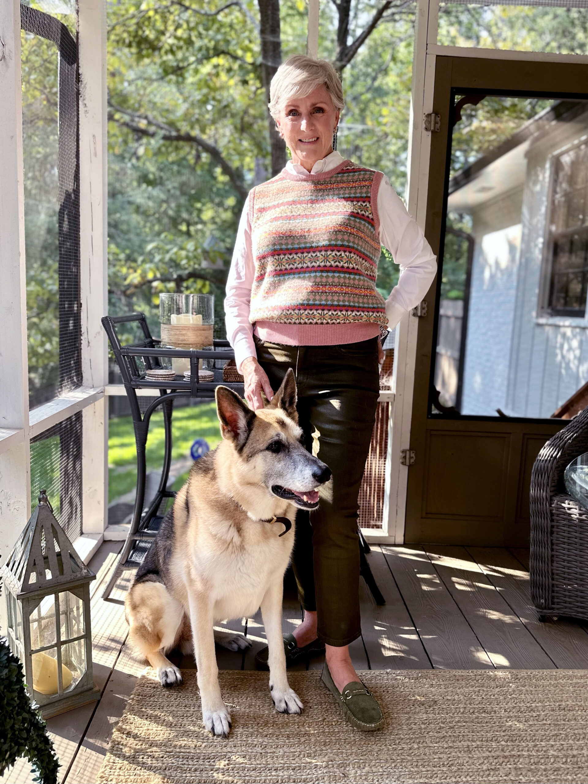 Happy Friday, gang! And it’s the last Friday in September. October is coming in fast, so it’s time to embrace all things fall. The weather has been absolutely beautiful in this neck of the woods, with lows in the 50s and highs hovering around 80-something. I’ll take it! Kelly is back with an a-ma-zing recipe, I have a yummy cocktail recipe to usher in the weekend – and we are wearing prints and patterns for fall. Of course, our favorite German Shepherd is making his weekly appearance. Are you ready to get this party started?! Or, at the very least, kick off the weekend!