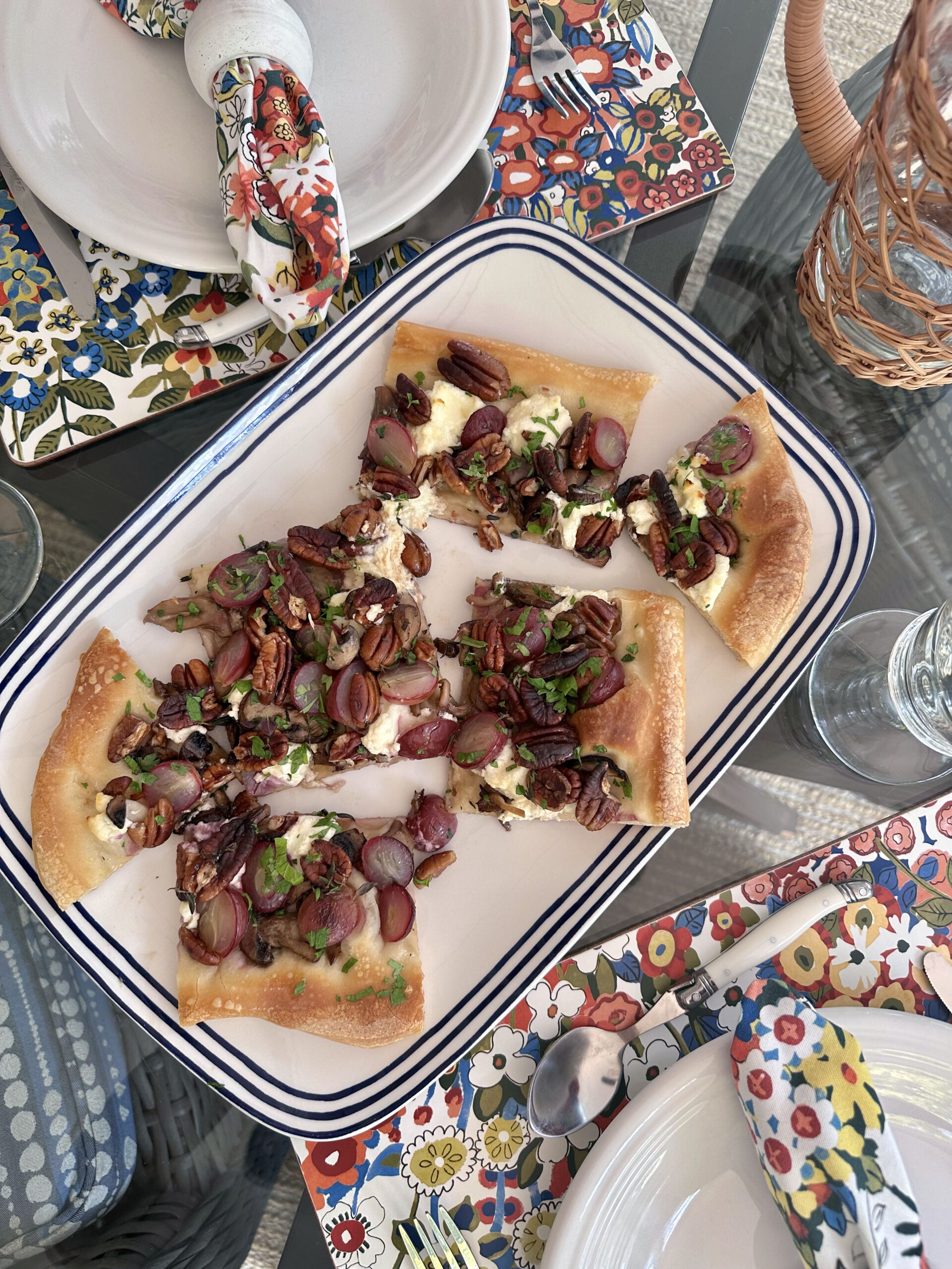This Mushroom Goat Cheese Flatbread is so easy and you can customize it to your liking. We are adding red grapes, pecans, and hot honey to the flatbread, giving it a fall cheeseboard feel. It’s a great appetizer or main dish.