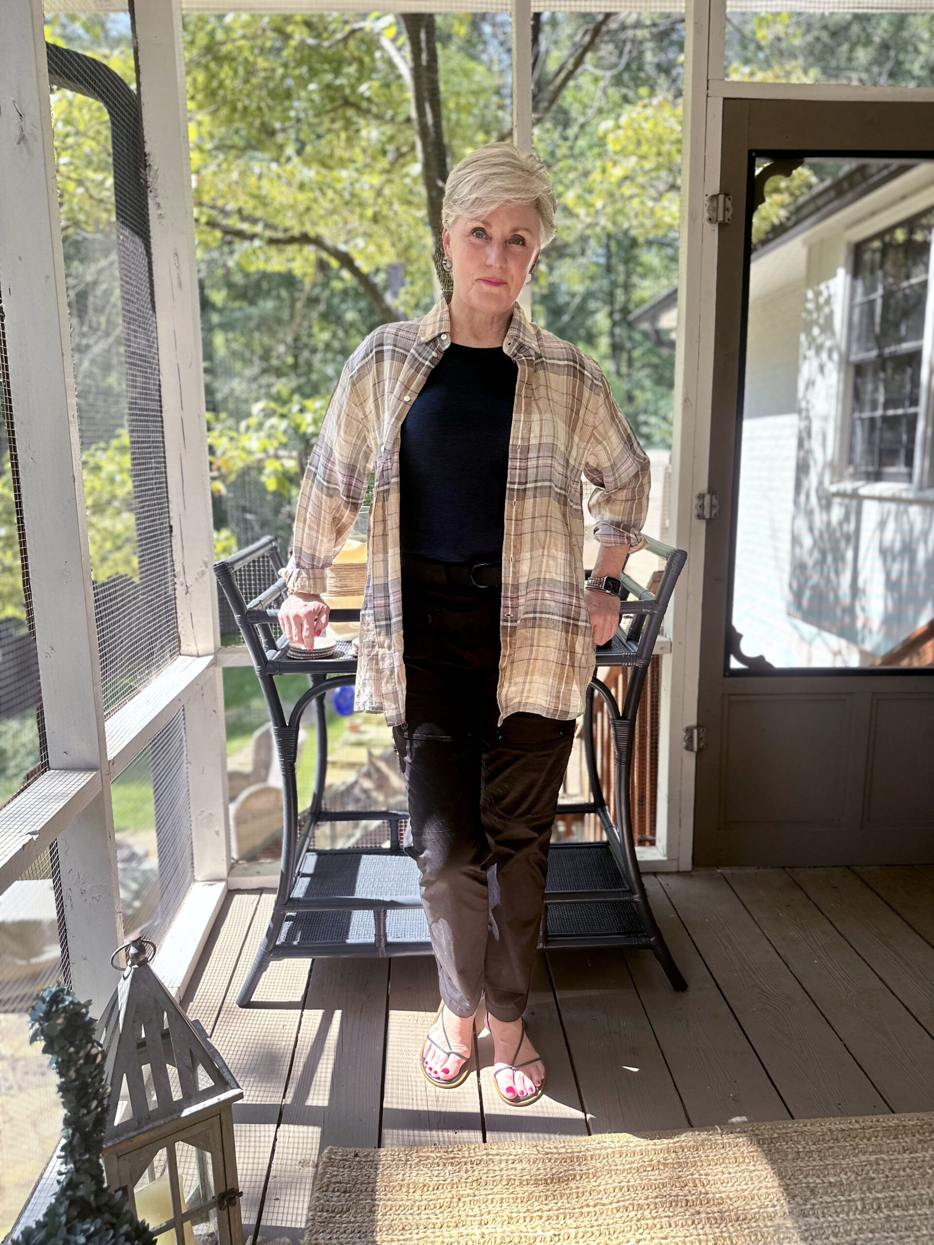Are you ready to kick off Friday? I know I am. And I always wear a comfy outfit. This week I popped an oversized plaid shirt over a navy tee and black cargo pants. A third layer always comes in handy this time of year as one never knows what mother nature will dish up weather-wise.