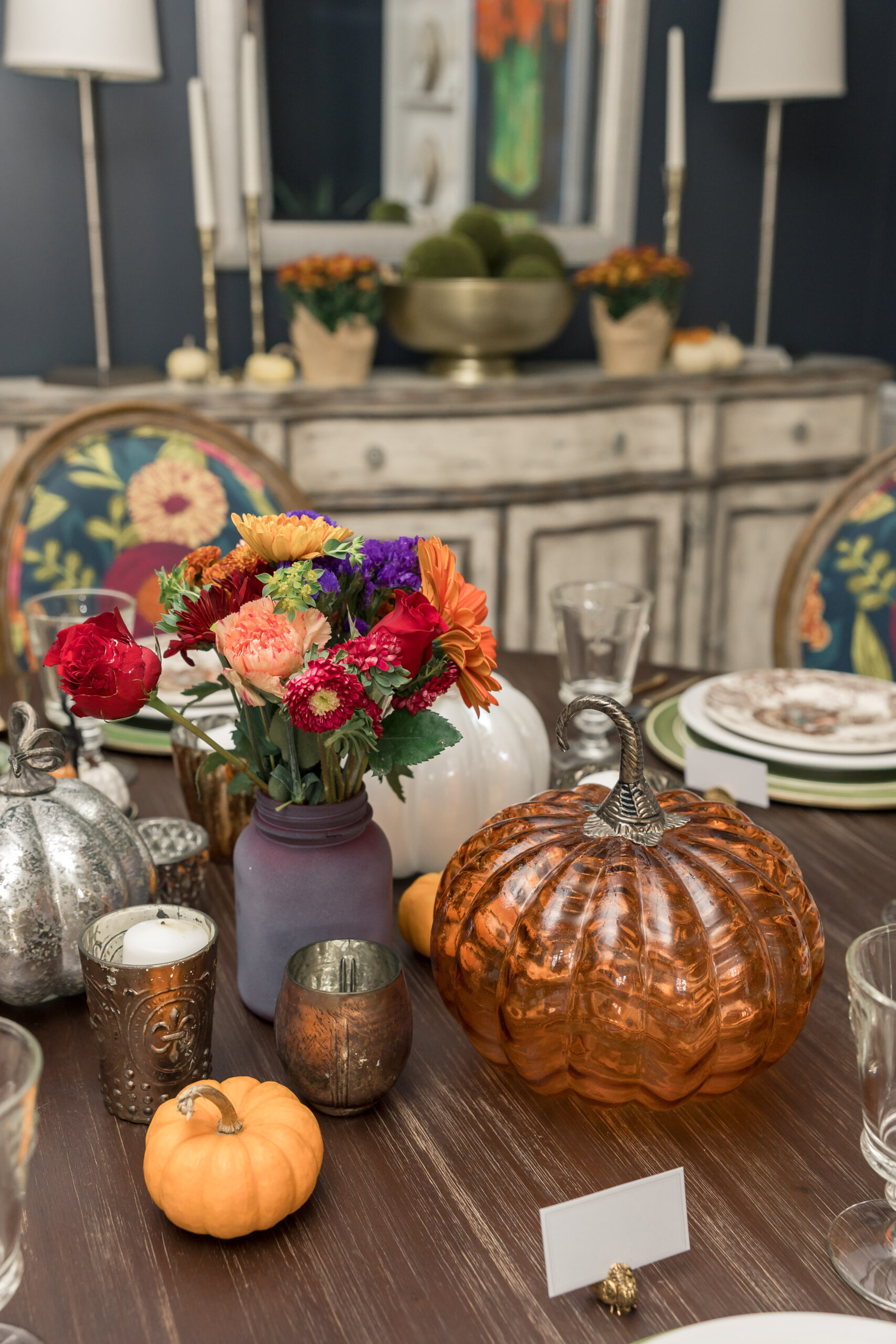 This year’s Thanksgiving tablescape is similar to last year’s; I have my Green Chargers in play, and they add a nice pop of green to contrast with the oranges and browns of my linens and centerpiece decor. As an alternative to Faux Pumpkins and Gourds that you can reuse year after year, try a Glass Pumpkin. Mine are old but there are beautiful versions in a variety of sizes and colors at Wayfair.