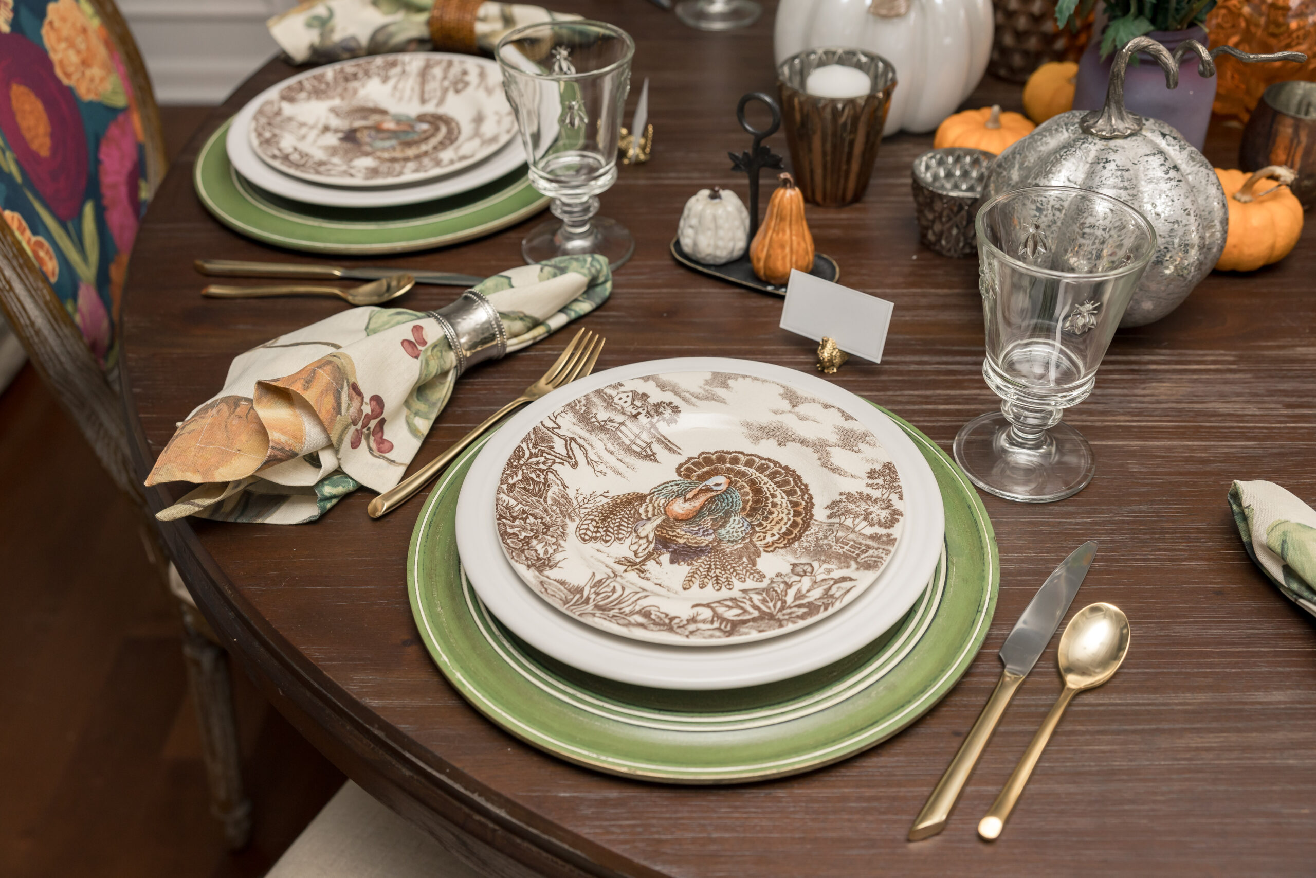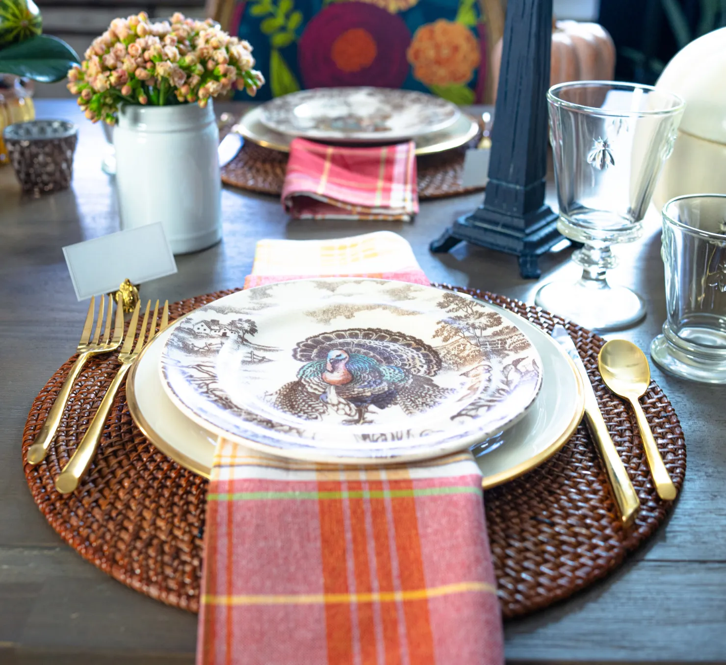 Round Rattan Placemat | Harvest Plaid Napkins | La Rochere Napoleon Bee Wine Goblets | La Rochere Napoleon Bee Tumblers | Similar Spode Turkey Salad Plates | Similar Gold-Rimmed Dinner Plate | Similar Gold Flatware | Similar Cake Stand (as centerpiece) | Faux Pumpkins and Gourds (as centerpiece) | Similar Pillar Candle Holders (as centerpiece) | Similar Mixed Glass Votives