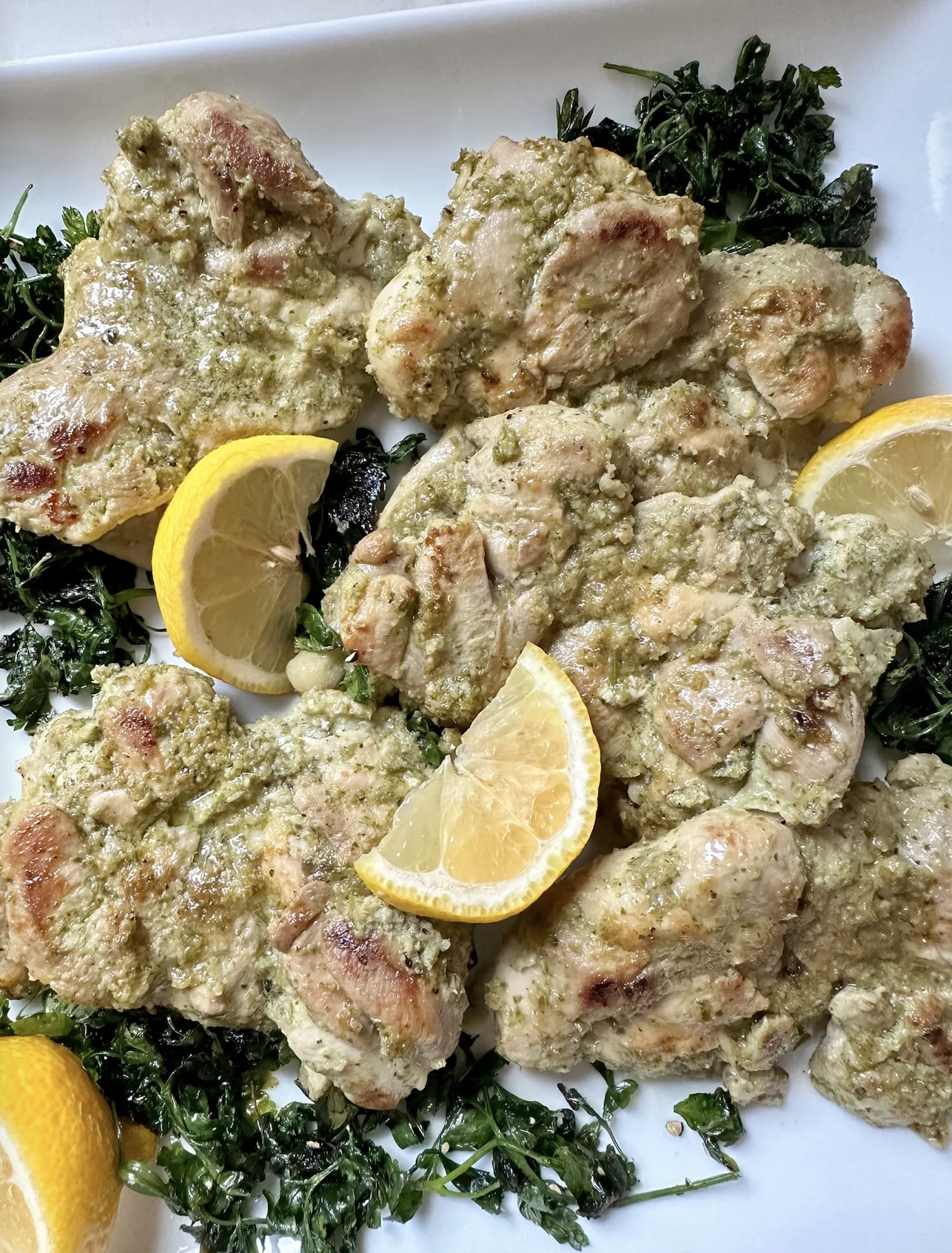 Today’s recipe really took me by surprise. I thought I knew how this would be while I gathered ingredients, imagining the flavors. But I was blown away by the amazing savory, herby flavor of these Chicken Thighs with Parsley and Lemon. Have you ever sautéd parsley as if it were thick leafy greens? I hadn’t, but now I want to add sautéd parsley leaves to everything!