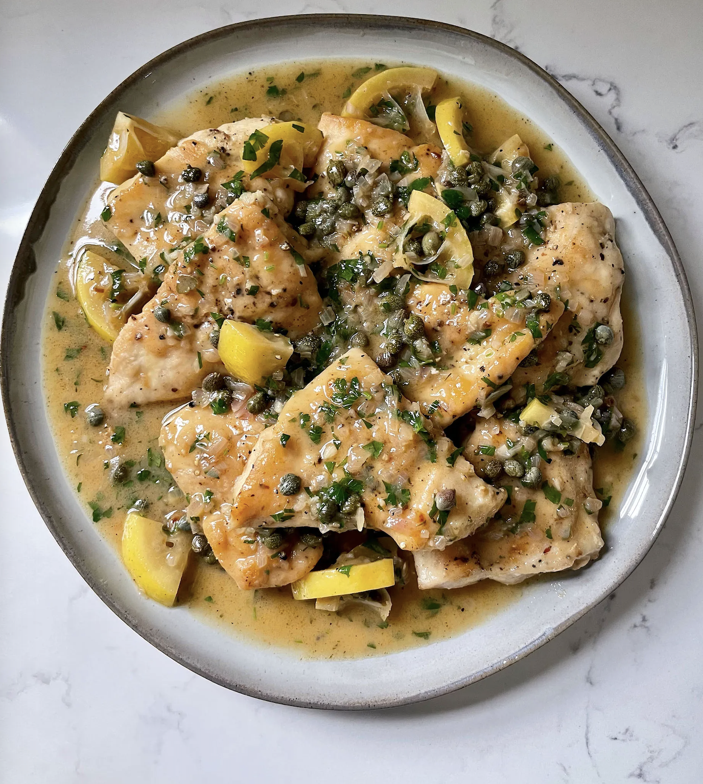 Today’s Sunday Supper is a classic dish: Chicken Piccata. Thin chicken breast cutlets in a bright lemony sauce with capers and shallots. Usually when I make chicken, we prefer thighs; they are more moist, tender and flavorful than breasts. This preparation of breast cutlets keeps them moist and flavorful though, because we will finish the cutlets in the sauce.