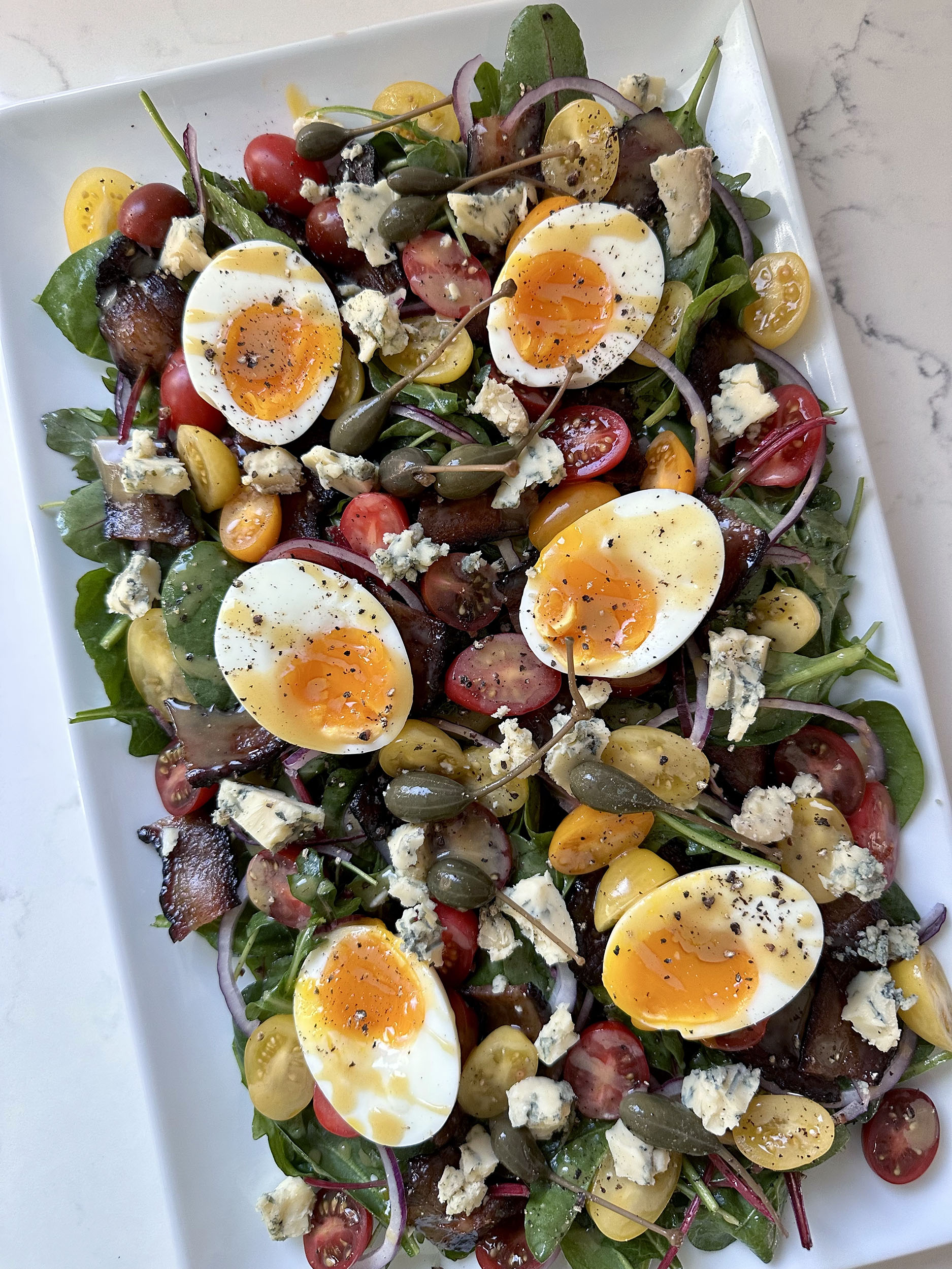 Hello and welcome to Djalali Cooks! I love a main dish salad and this one is really fantastic. Super greens dressed in a white balsamic and Dijon dressing creates the base. With savory bacon pieces, colorful grape tomatoes, thin red onion slices, and 8-minute eggs. I topped the salad with small chunks of creamy Blue Stilton cheese and caper berries. A perfect main dish salad for two, it’s Super Greens Salad with Bacon and Eggs! Let’s do it.