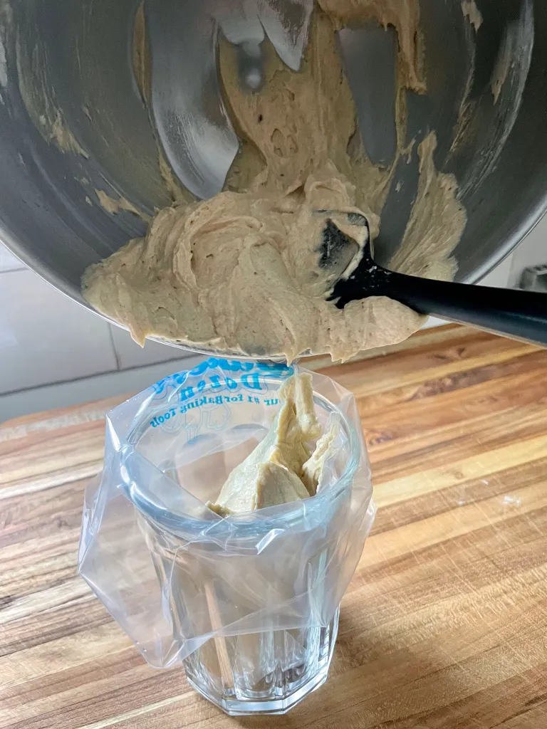 With the mixer running on low, pour in the apple cider in a slow and steady stream. Continue mixing until the apple cider is fully incorporated. Scrape down the sides and give it a few mixes by hand to ensure you have a smooth, well-mixed batter.